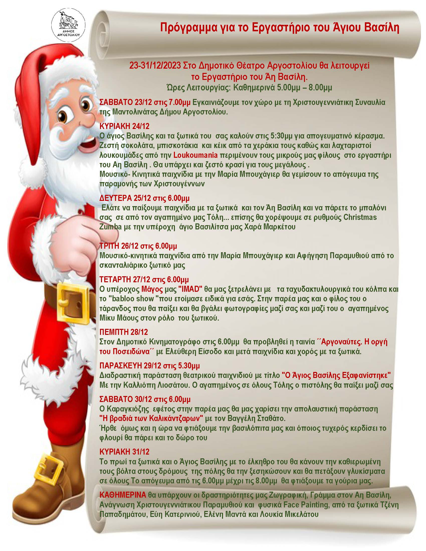 Το Σάββατο 23 Δεκεμβρίου ανοίγει και πάλι το Εργαστήριο του Άγιου Βασίλη, στον ισόγειο χώρο του  Δημοτικού Θεάτρου Αργοστολίου «Ο Κέφαλος», όπου  εκεί θα πραγματοποιούνται εορταστικά δρώμενα για παιδιά & νέους, όπως εικαστικές κατασκευές, γράμμα στον Αη Βασίλη, αφήγηση παραμυθιών, Face painting ενώ εκεί φυσικά, θα βρίσκεται και ο Άγιος Βασίλης.