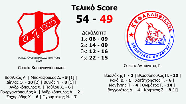 Η ομάδα της Κεφαλονιάς δεν κατάφερε να πάρει το ροζ φύλλο, αυτή τη φορά. Σε ένα παιχνίδι που δεν είχε καμία βαθμολογική σημασία για την ομάδα της Κεφαλονιάς, ο ΚΑΟ έδωσε αρκετό χρόνο συμμετοχής στους ‘μικρούς’ του και σε παίχτες που δεν είχαν πολύ χρόνο συμμετοχής στο πρωτάθλημα. Έτσι ηττήθηκε με 54 – 49.