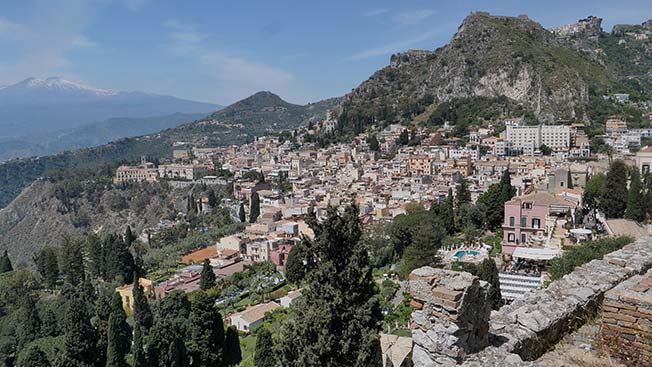 Από την κορυφή της πλαγιάς, πάνω στην οποία είναι κυριολεκτικά γαντζωμένη η Ταορμίνα, η θέα είναι απλά απερίγραπτη! Στα πόδια σου απλώνεται η πόλη, λίγο πιο κάτω η θάλασσα, στο βάθος βορειοδυτικά το επιβλητικό ηφαίστειο Αίτνα (υψόμετρο 3329 μέτρα), που συνεχώς «καπνίζει» απειλητικά από τους δύο κρατήρες του, και ανατολικά το καταγάλανο Ιόνιο Πέλαγος.