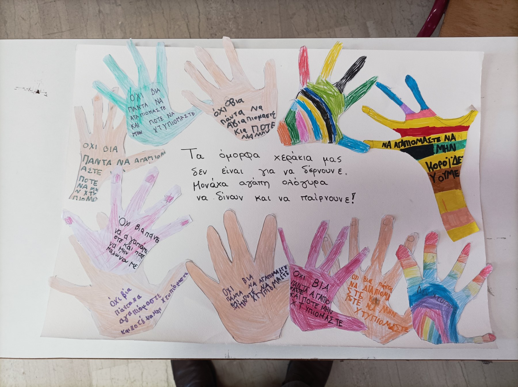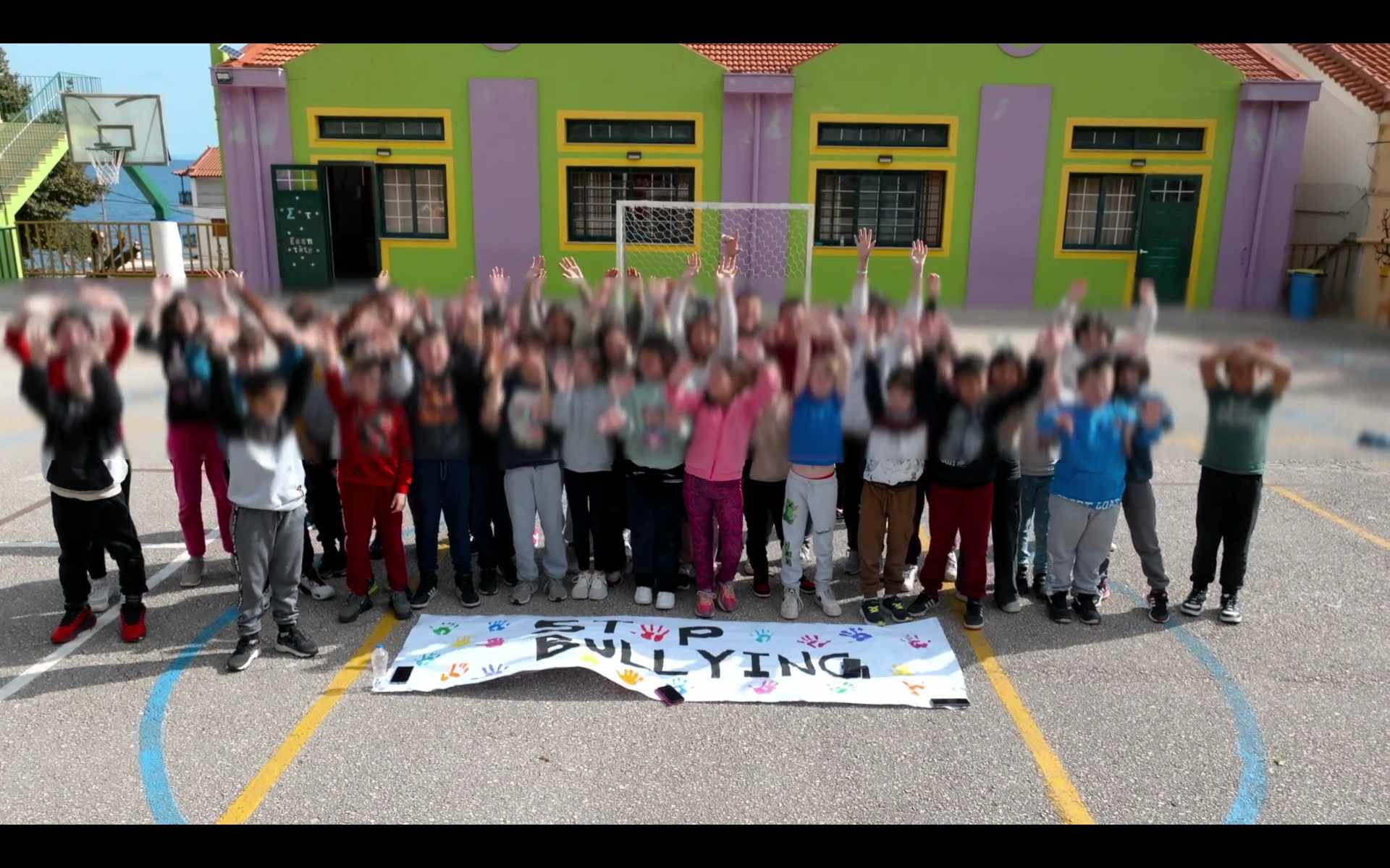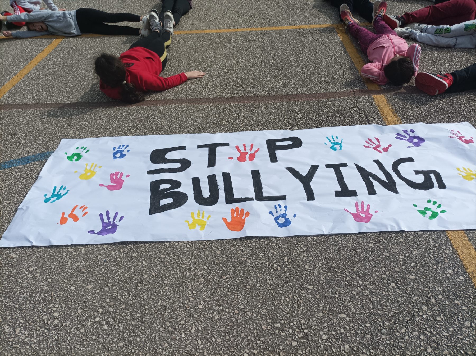 Κάθε χρόνο τέτοια μέρα, 6 Μαρτίου, οφείλουμε να γιορτάζουμε αυτό το γεγονός, ώστε να ευαισθητοποιούνται γονείς και μαθητές και εκπαιδευτικοί για αυτή τη μάστιγα. Με πρωτοβουλία λοιπόν των εκπαιδευτικών, οι μαθητές των Δ΄-Ε’-ΣΤ’ τάξεων πέρασαν ένα σαφές, μήνυμα, με σκοπό να αντηχήσει απ’ άκρη σ’ άκρη. Τρεις λέξεις που αποτυπώνουν πλήρως την επιθυμία όλων μας, «ΟΧΙ ΣΤΗ ΒΙΑ». Επίσης οι μαθητές της ΣΤ’ έφτιαξαν πανό με το μήνυμα «STOP BULLYING», χρωματίζοντας το με τις παλάμες τους.