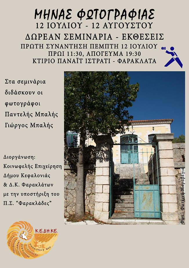 Αργοστόλι ΦΑΡΑΚΛΑΤΑ, Πέμπτη 12 Ιουλίου,  στο πολιτιστικό κέντρο “Παναΐτ Ιστράτι”.  Μήνας φωτογραφίας Κεφαλονιά φωτογραφικός προορισμός Η Κ.Ε.ΔΗ.ΚΕ. & η Δ.Κ Φαρακλάτων διοργανώνουν ΔΩΡΕΑΝ Σεμινάρια Φωτογραφίας και Photoshop από τον καταξιωμένο φωτογράφο Παντελή Μπαλή & τον Γιώργο Μπαλή. Τα τμήματα θα λειτουργούν καθημερινά το πρωί στις 11.30πμ ή το απόγευμα 7.30μμ. Διάρκεια έως Κυριακή 12/8 2018. Με την υποστήριξη του Π.Σ. «Οι Φαρακλάδες».