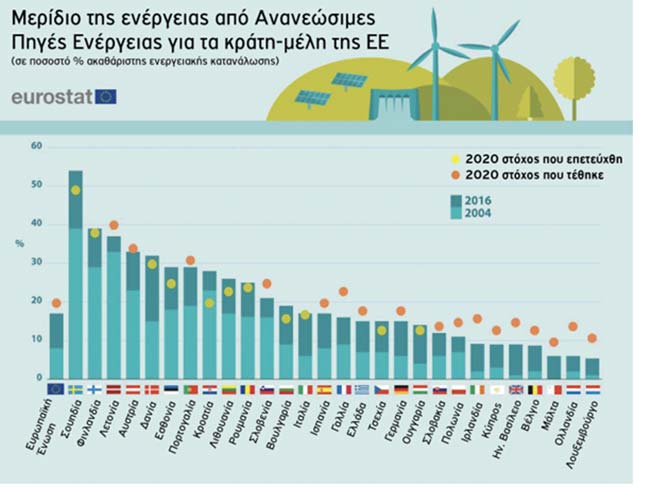 Μερίδιο της ενέργειας από Ανανεώσιμες Πηγές Ενέργειας για τα κράτη – μέλη της ΕΕ.