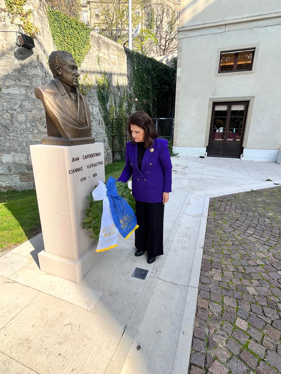 Ευρισκόμενη στην Γενεύη η πρ. Περιφερειάρχης Ιονίων νήσων Ρόδη Κράτσα Τσαγκαροπούλου κατέθεσε δάφνινο στεφάνι στην προτομή του Ιωάννη Καποδίστρια, προερχόμενο από την Ελλάδα.