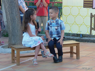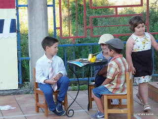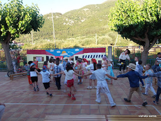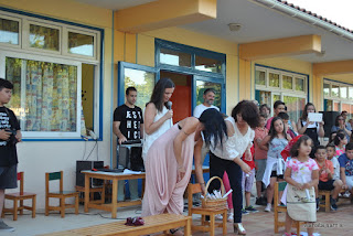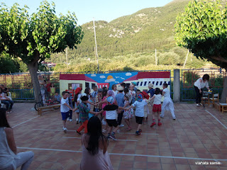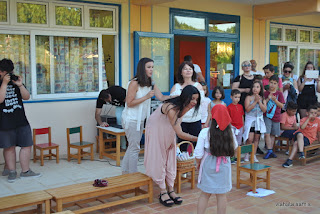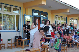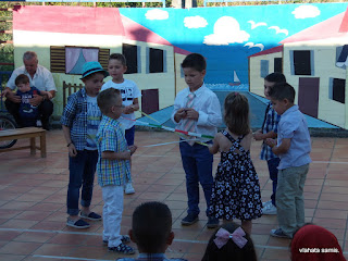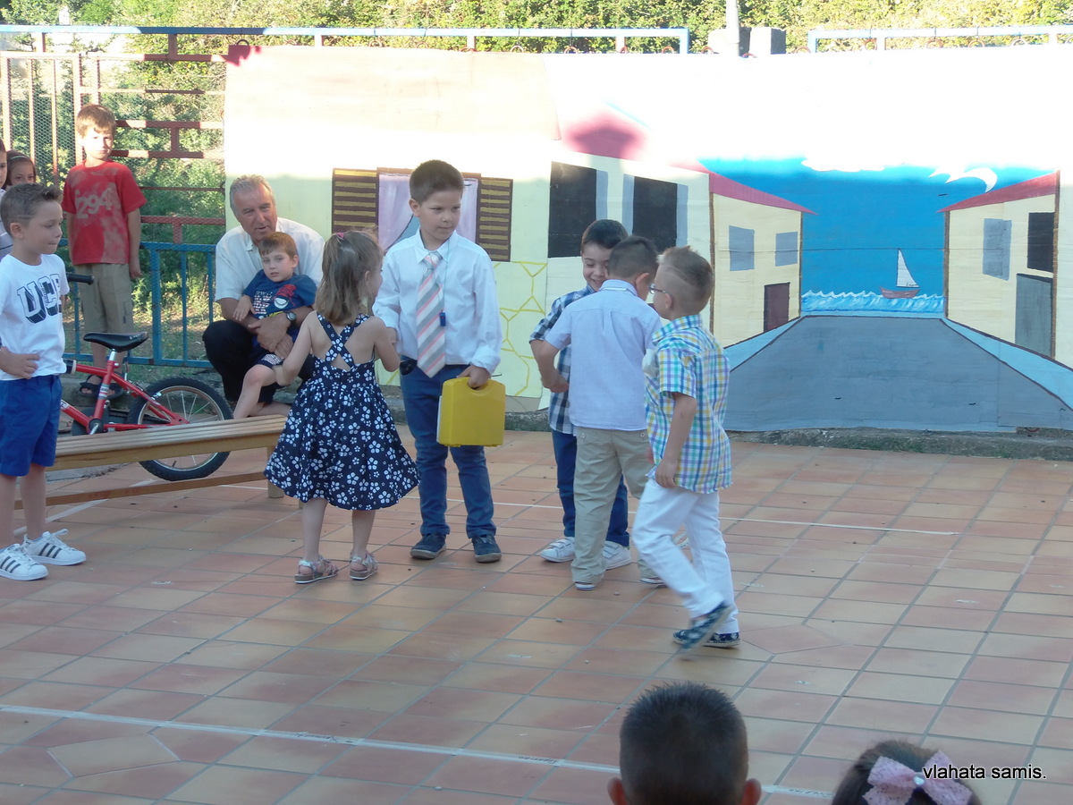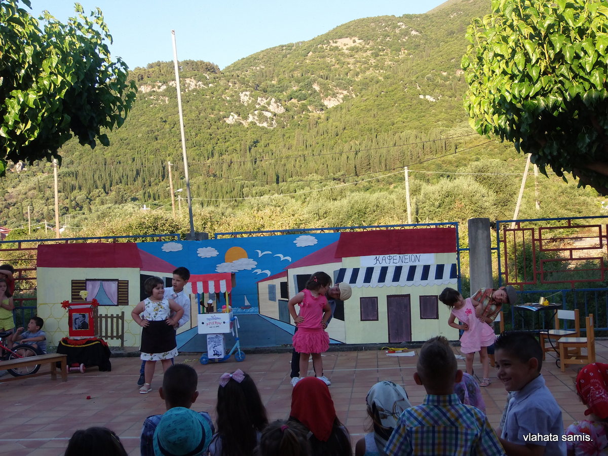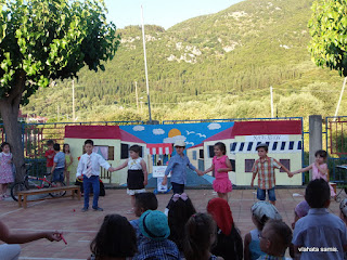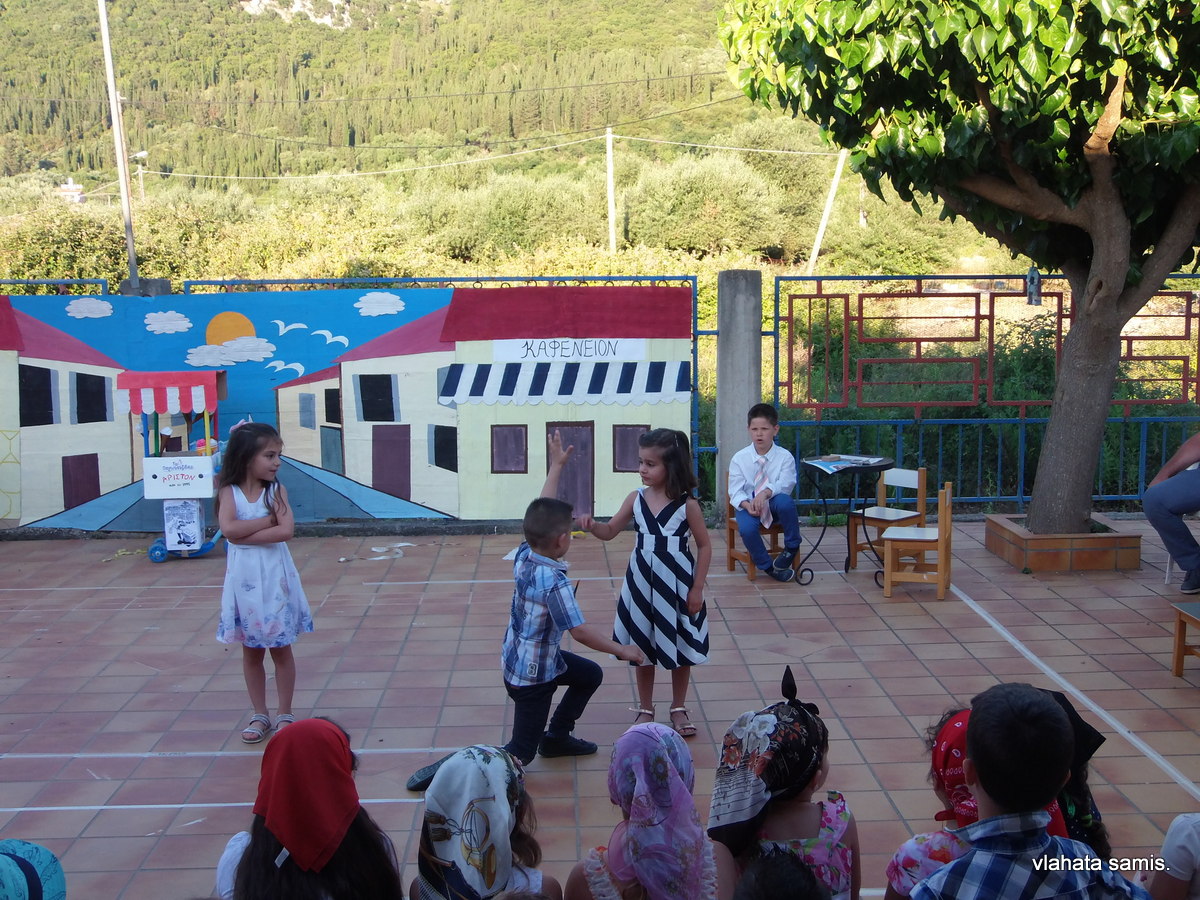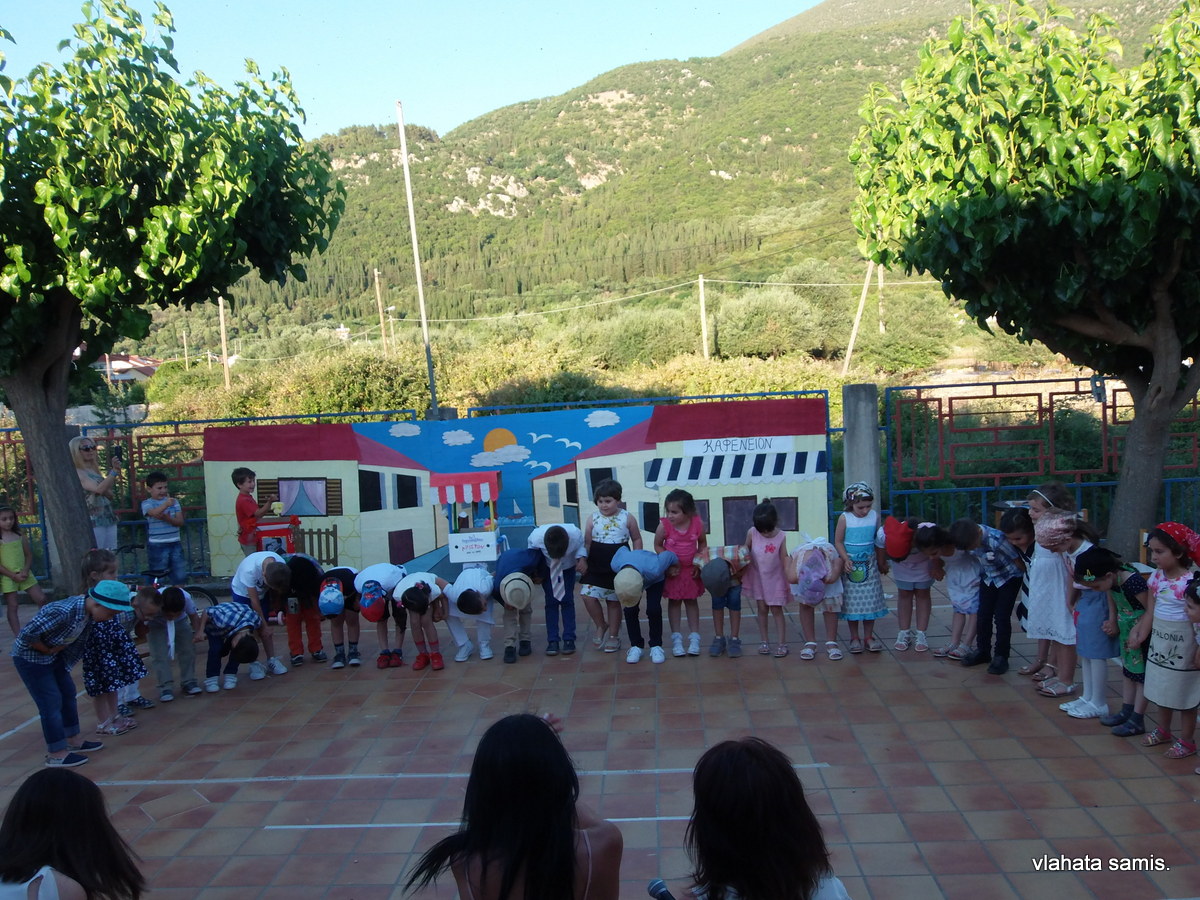 Ακολούθησαν τα παιδιά, με ένα μικρό θεατρικό, αναφορά στη παραδοσιακή πλατεία ενός φανταστικού χωριού, που ο Δήμαρχος αποφάσισε να γκρεμίσει, για να φτιάξει καινούργια, με γρανίτες, κοκοφοίνικες και διάφορα άλλα…νεωτεριστικά. Οι κάτοικοι του χωριού, δεμένοι συναισθηματικά με τη πλατεία τους, κάλεσαν τον Δήμαρχο και του έδειξαν τις όμορφες στιγμές που έχουν περάσει και περνούν εκεί! Από μπροστά του “παρέλασαν”, ο “Παναής με τα κορίτσια του”, ο “λατερνατζής’, ο “παγωτατζής”, ο “μικρός με το ποδήλατο”, “κάτοικοι του χωριού σε χαρούμενες στιγμές”, μέχρι και ο ¨αλλοδαπός τουρίστας”. Όλοι αυτοί…ανάγκασαν τον Δήμαρχο, να αναγνωρίσει το “δέσιμο” των κατοίκων με το συγκεκριμένο σημείο του χωριού, με αποτέλεσμα, την απόφασή του, να τους “ακούσει” και να αφήσει την πλατεία ως έχει! Πολύ όμορφη ιστορία, με πολύ γέλιο, αλλά και συγκίνηση, για την όση ομορφιά έχει απομείνει και σιγά – σιγά χάνεται, δίνοντας τη θέση της, στο κακό ξενόφερτο και στο κιτς! Εκτός της κ. Βασιλοπούλου, τη γιορτή αυτή, δίδαξαν στα παιδιά και στήριξαν οι κες Μπέλλη Βάσω και Χριστοπούλου Αικατερίνη, επίσης δασκάλες του νηπιαγωγείου. Μετά το θεατρικό, ακολούθησαν, απονομή αναμνηστικών διπλωμάτων στα παιδιά και μπουφές με μεζέδες και αναψυκτικά, που προσέφεραν οι γονείς των παιδιών. Κλείνοντας να πούμε, πως η χτεσινή εκδήλωση, ήταν μια μοναδική βραδιά για όλους μας και αποδεικνύει με τον πιο όμορφο τρόπο, τη σπουδαία δουλειά που γίνεται τα τελευταία χρόνια, στο νηπιαγωγείο της Σάμης!