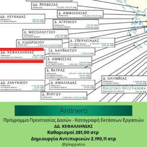 Σε εξέλιξη βρίσκεται το πρόγραμμα προστασίας των δασών ΑntiΝero III του Υπουργείου Περιβάλλοντος και Ενέργειας σχετικά με τη διαχείριση των δασικών περιοχών για την πρόληψη και την προστασία των δασών στο Νομό Κεφαλονιάς.