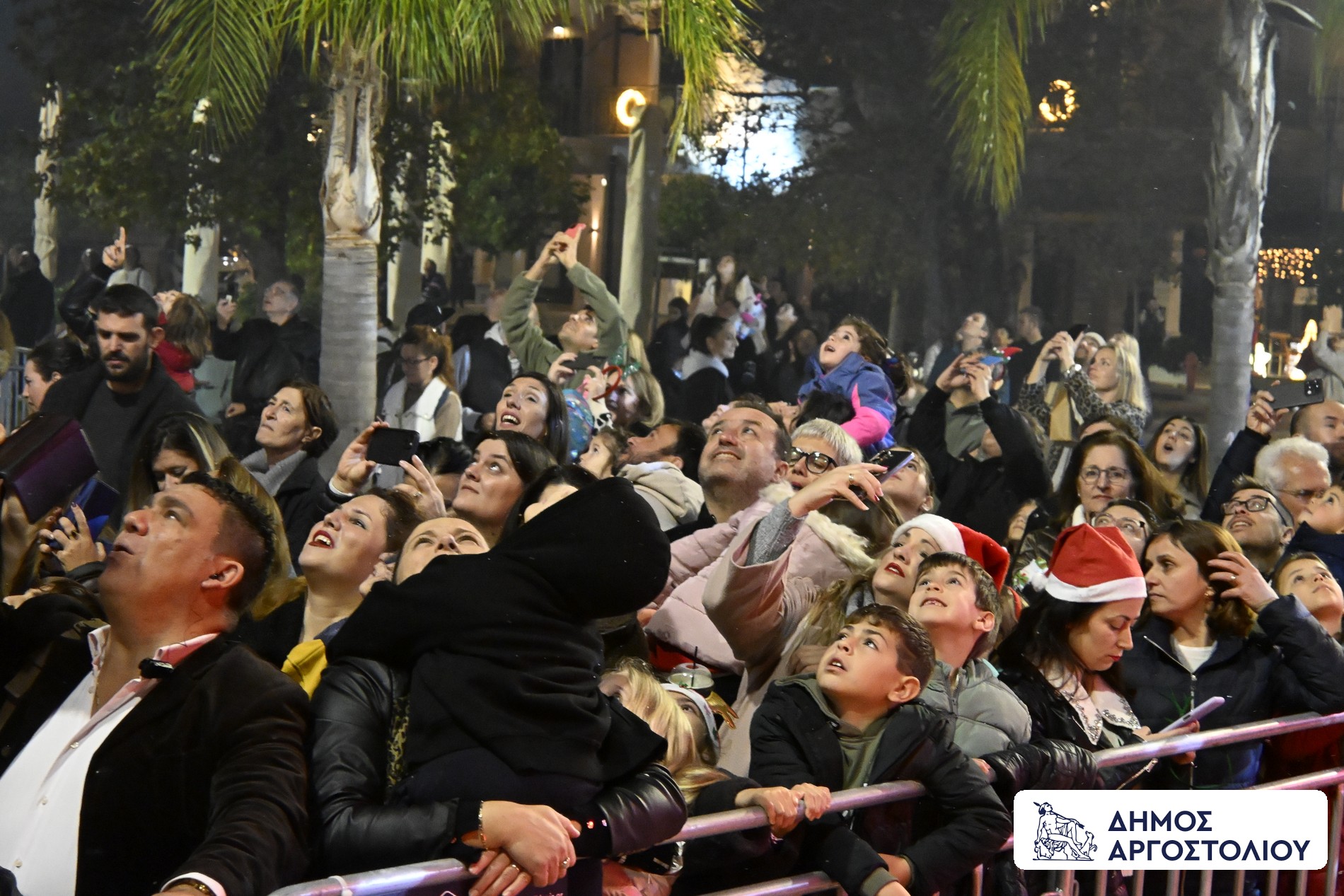 Η στιγμή της φωταγώγησης συνοδεύτηκε από εντυπωσιακά πυροτεχνήματα, τα οποία φώτισαν τον Αργοστολιώτικο ουρανό και προσέφεραν ένα μοναδικό θέαμα στους παρευρισκόμενους.
