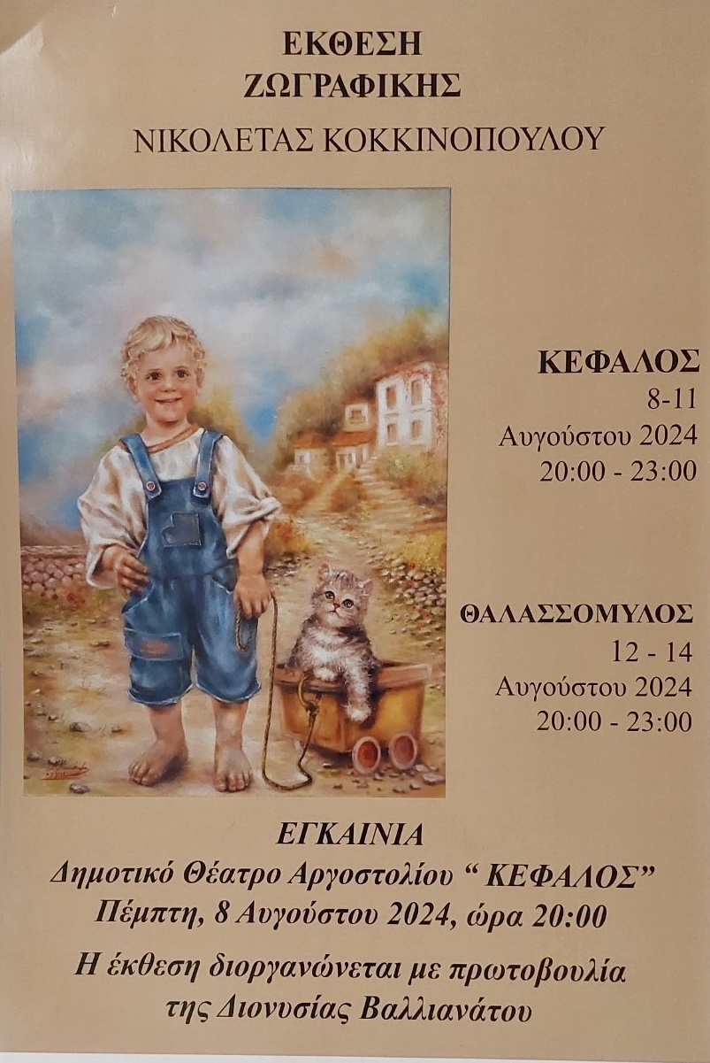 Την Πέμπτη 8 ΑΥΓΟΥΣΤΟΥ στο Δημοτικό Θέατρο Αργοστολίου ο «ΚΕΦΑΛΟΣ» στην Αίθουσα Αντίοχου & Σπύρου Ευαγγελάτου, παρουσιάζεται η ατομική Έκθεση Ζωγραφικής της Νικολέτας Κοκκινοπούλου.