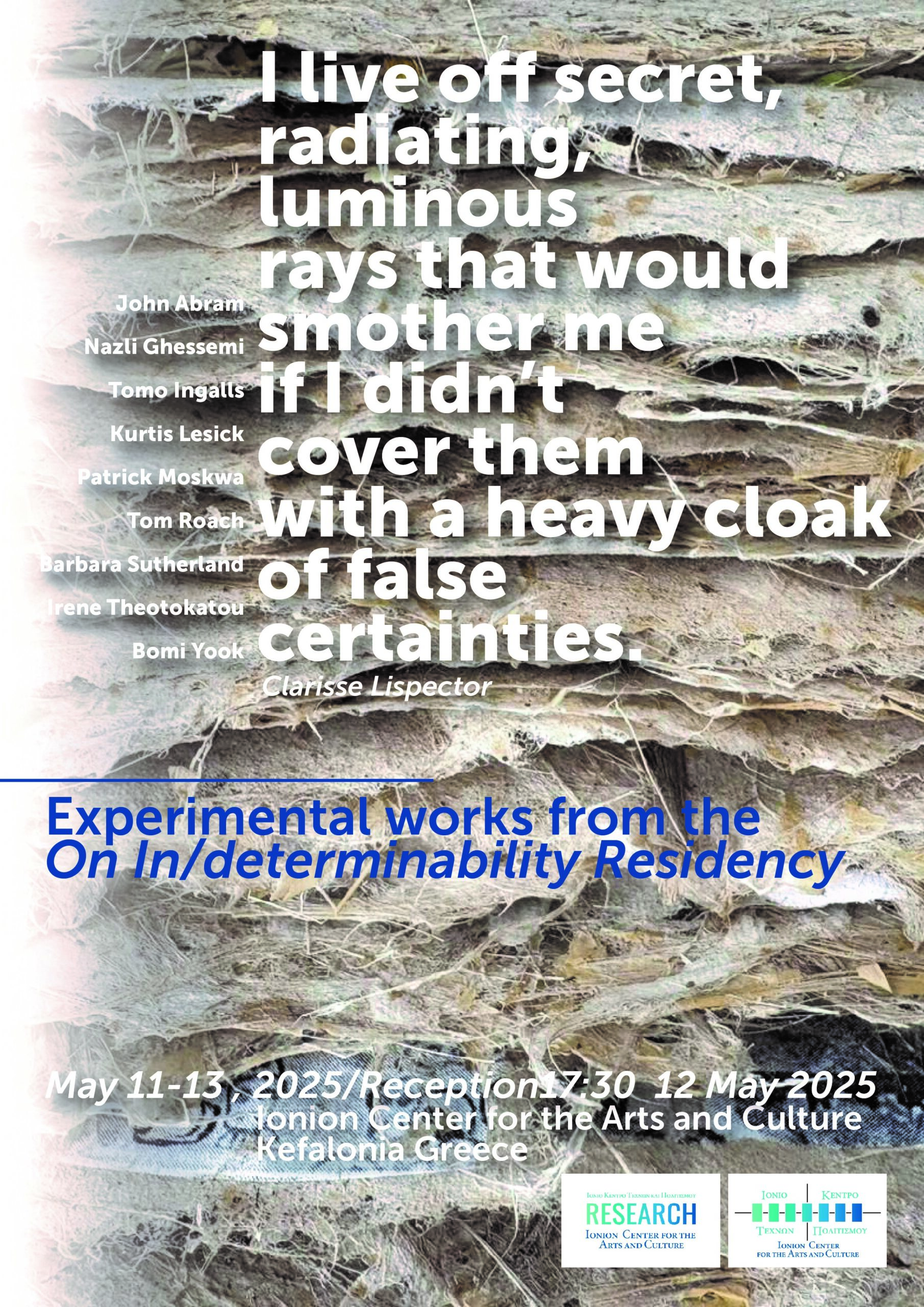 Ανοιχτή Πρόσκληση για την έκθεση πειραματικών έργων του προγράμματος On In/Determinability: Art and Speculative Ontology, Δευτέρα 12 Μαΐου 2025, Ιόνιο Κέντρο Τεχνών & Πολιτισμού και ώρα 7.30 βραδυνή.