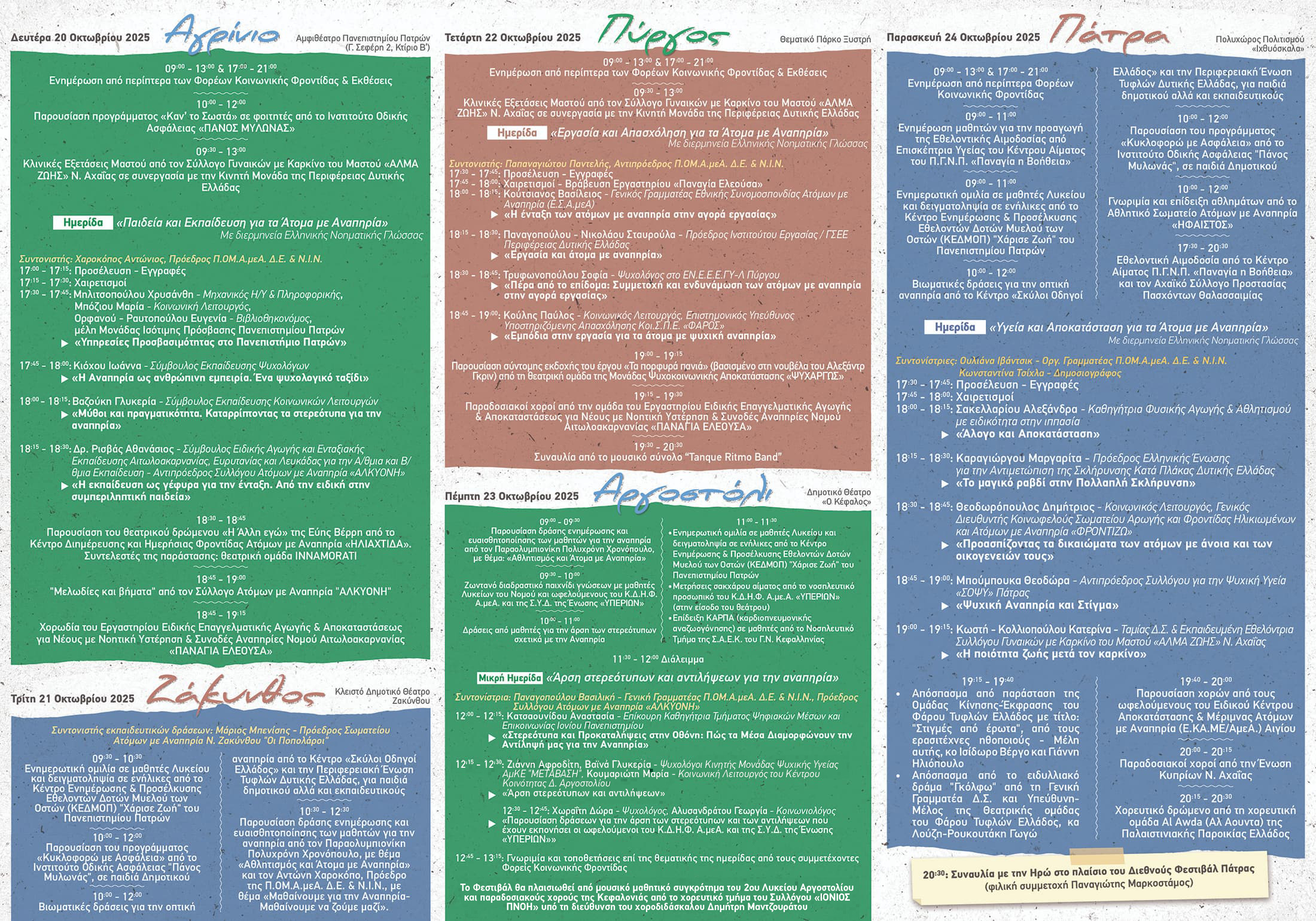 Στο Αμφιθέατρο του Πανεπιστημίου Πατρών (Γ. Σεφέρη 2, Κτίριο Β’) θα στηθούν ενημερωτικά περίπτερα και εκθέσεις των Φορέων Κοινωνικής Φροντίδας. Οι φοιτητές θα παρακολουθήσουν το πρόγραμμα «Καν’ το Σωστά» από το Ινστιτούτο Οδικής Ασφάλειας «Πάνος Μυλωνάς». Παράλληλα, θα πραγματοποιηθούν Κλινικές Εξετάσεις Μαστού από τον Σύλλογο Γυναικών με Καρκίνο του Μαστού «ΑΛΜΑ ΖΩΗΣ» Ν. Αχαΐας, σε συνεργασία με την Κινητή Μονάδα της Περιφέρειας Δυτικής Ελλάδας. Στο πρόγραμμα περιλαμβάνονται επίσης ημερίδα για την Παιδεία και την Εκπαίδευση των Ατόμων με Αναπηρία, θεατρικό δρώμενο «Η Άλλη εγώ» της Εύης Βέρρη από τη θεατρική ομάδα “INNAMORATI” του Κέντρου Διημέρευσης και Ημερήσιας Φροντίδας Ατόμων με Αναπηρία «ΗΛΙΑΧΤΙΔΑ», μουσικοχορευτικό δρώμενο «Μελωδίες και βήματα» από τον Σύλλογο Ατόμων με Αναπηρία «ΑΛΚΥΟΝΗ» και χορωδία του Εργαστηρίου Ειδικής Επαγγελματικής Αγωγής & Αποκαταστάσεως για Νέους με Νοητική Υστέρηση & Συνοδές Αναπηρίες Νομού Αιτωλοακαρνανίας «ΠΑΝΑΓΙΑ ΕΛΕΟΥΣΑ».