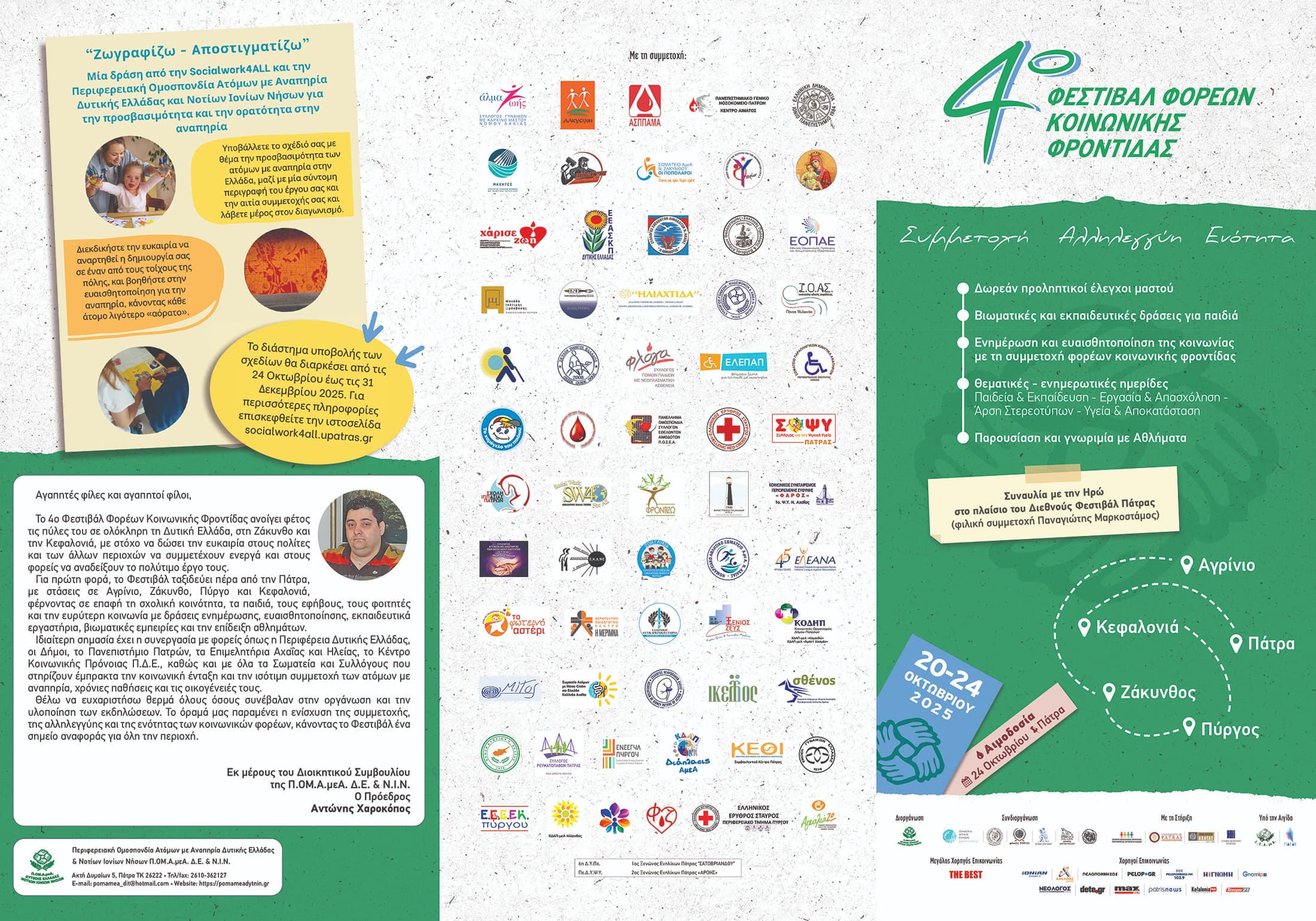 Η Περιφερειακή Ομοσπονδία Ατόμων με Αναπηρία Δυτικής Ελλάδας & Νοτίων Ιονίων Νήσων διοργανώνει το 4ο Φεστιβάλ Φορέων Κοινωνικής Φροντίδας, που φέτος επεκτείνεται δυναμικά και γεωγραφικά, δίνοντας την ευκαιρία σε περισσότερες τοπικές κοινωνίες να συμμετάσχουν και να αναδείξουν τις δομές, τις ανάγκες και τις καλές πρακτικές κοινωνικής φροντίδας. Το Φεστιβάλ θα πραγματοποιηθεί 20-24 Οκτωβρίου 2025 με σταθμούς: Αγρίνιο, Ζάκυνθος, Πύργος, Αργοστόλι και Πάτρα.
