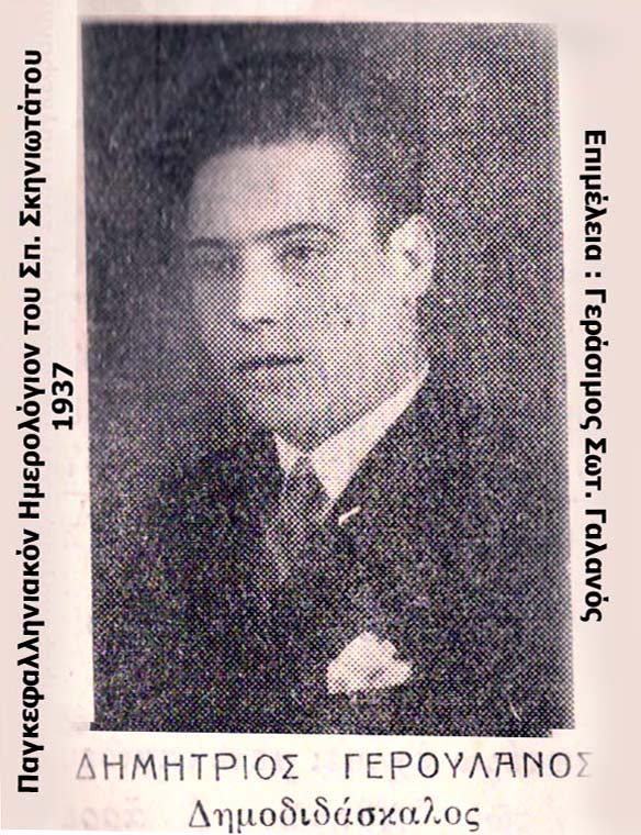 Η ιστορία της Πρωτοβάθμιας Εκπαίδευσης Κεφαλληνίας του οφείλει το σπουδαίο άρθρο του – έκθεση- , που μας ενημερώνει για την πορεία της εκπαίδευσης στην Κεφαλληνίας εκείνα τα χρόνια.(Βλ. Σπυρίδων Σκηνιωτάτος, Παγκεφαλληνιακόν Ημερολόγιον, 1937, σ.σ.150-160, όπου άρθρο του Δημητρίου Γερουλάνου Η Δημοτική Εκπαίδευσις εν Κεφαλληνία κατά το Σχολικόν Έτος 1935-1936» .