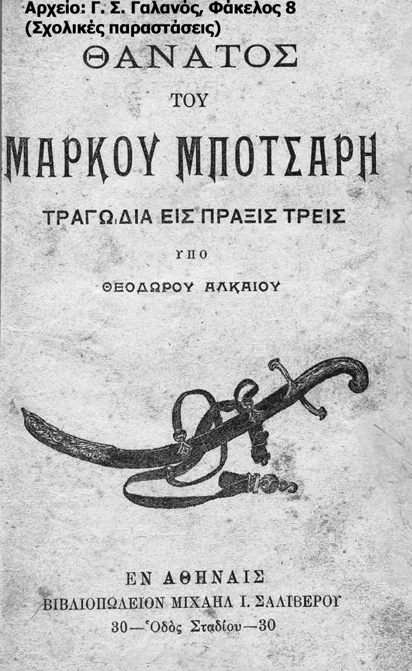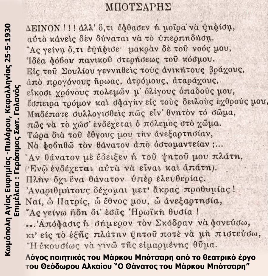 Συνεχίζοντας την αναφορά μου για την σπουδαία θεατρική παράσταση «Ο θάνατος του Μάρκου Μπότσαρη» του Θεόδωρου Αλκαίου, που παίχτηκε με πολλή επιτυχία, στις γιορτές της Εκατονταετηρίδα της Ελληνικής Ανεξαρτησίας, στην Αγία Ευφημία της Πυλάρου, στις 25-5-1930, φανερώνω, σύμφωνα με το αρχειακό υλικό που έχω, τους δυο πρωταγωνιστές – καθοδηγητές αυτής της μεγάλης, για τα τότε θεατρικά καλλιτεχνικά δρώμενα, επιτυχίας στο νησί μας.