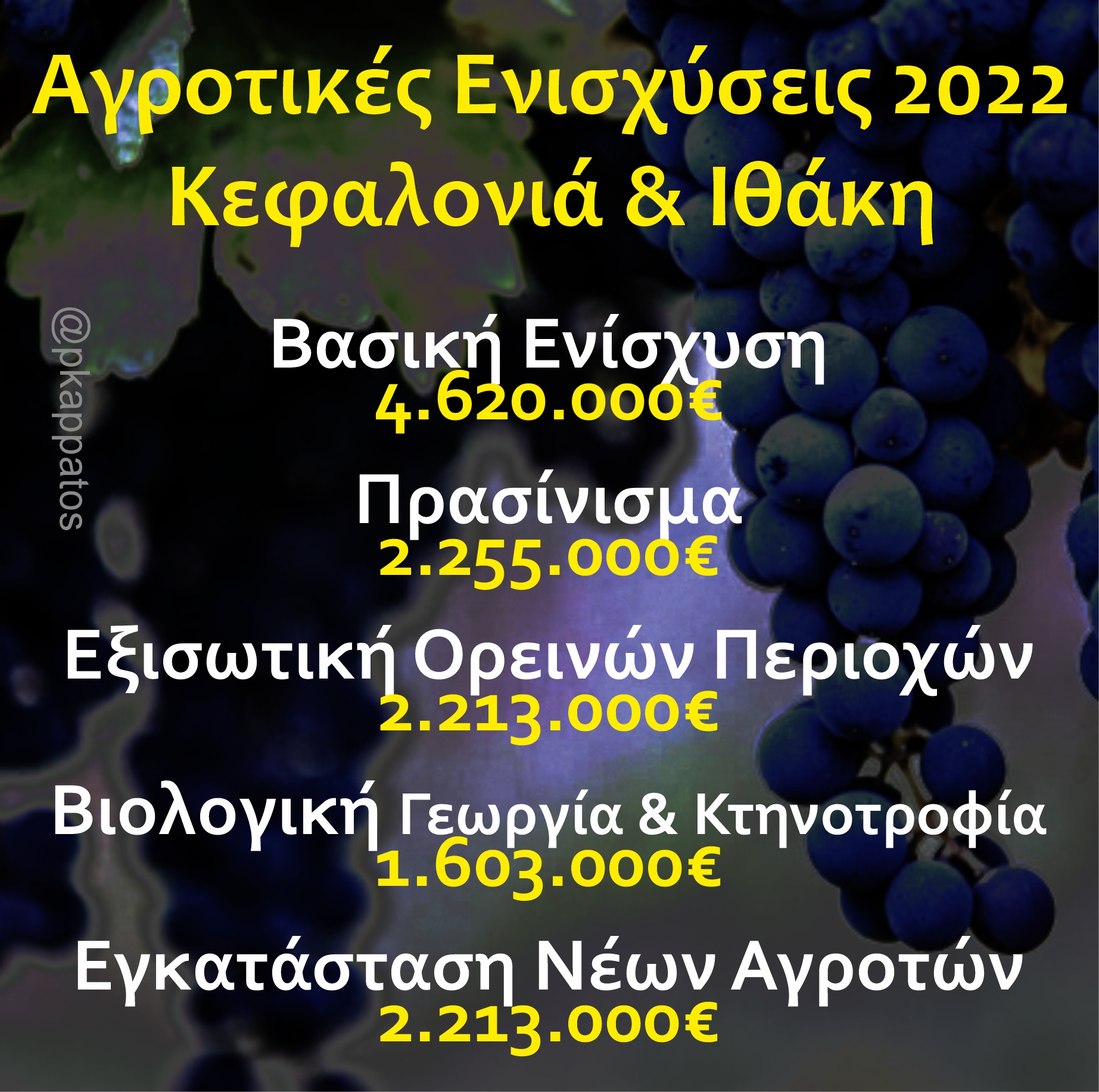 • Καθεστώς βασικής ενίσχυσης (Κεφαλονιά: 4.403.000€ / Ιθάκη: 216.500€)