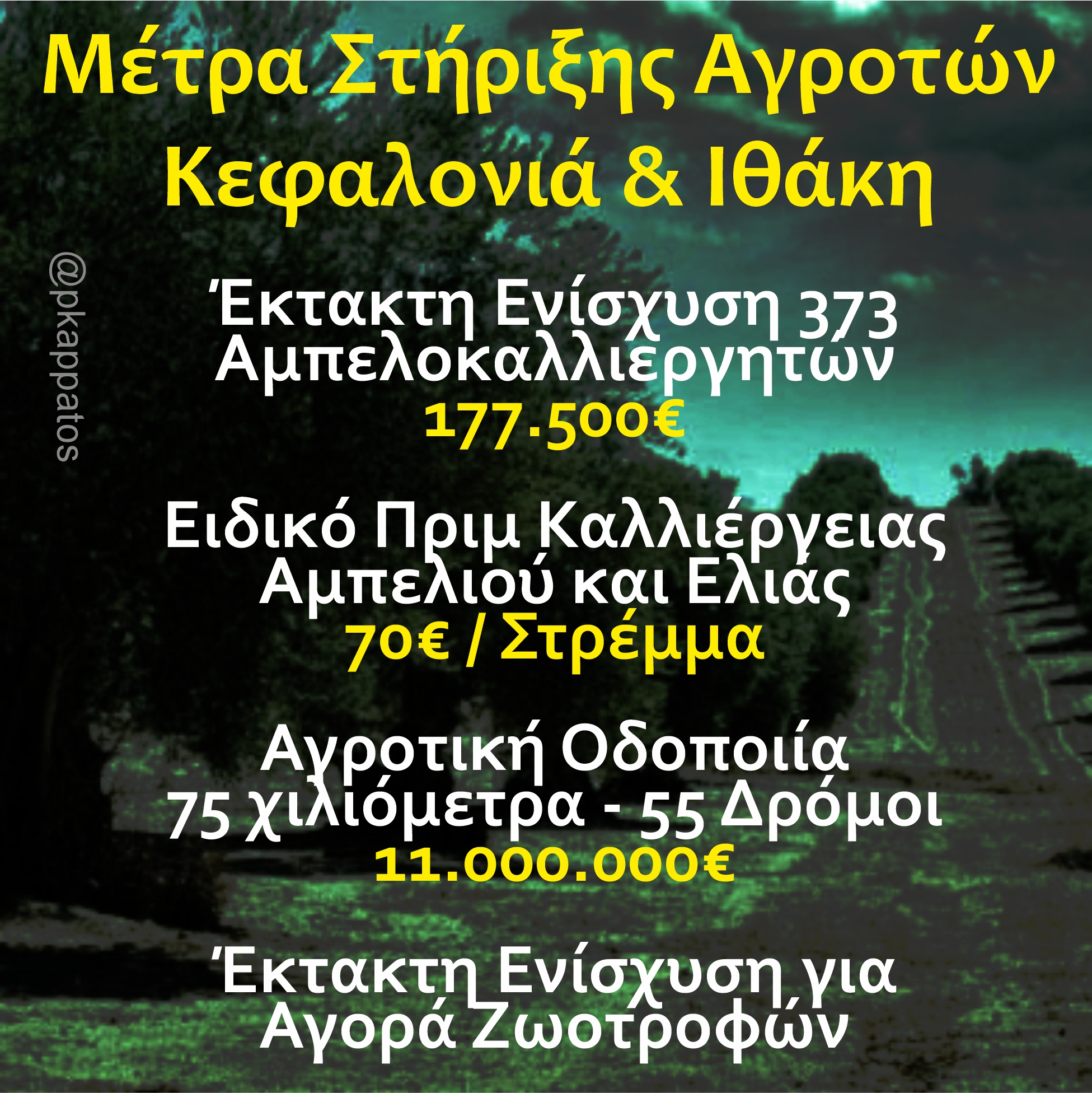 Σε τοπικό επίπεδο υπήρξε έκτακτη ενίσχυση 373 αμπελοκαλλιεργητών με 177.500€ λόγω των επιπτώσεων του πολέμου στην Ουκρανία. Με τη νέα ΚΑΠ κερδίσαμε ειδική ενίσχυση 70€/στρέμμα για την ελαιοκαλλιέργεια και την αμπελοκαλλιέργεια στα νησιά μας Για την περεταίρω ενίσχυση της αγροτικής παραγωγής, έχουμε εξασφαλίσει τη μεγαλύτερη χρηματοδότηση για αγροτική οδοποιία στη σύγχρονη ιστορία της Κεφαλονιάς με βελτίωση 55 αγροτικών οδών, συνολικού μήκους 75 χιλιομέτρων με 11.000.000€.