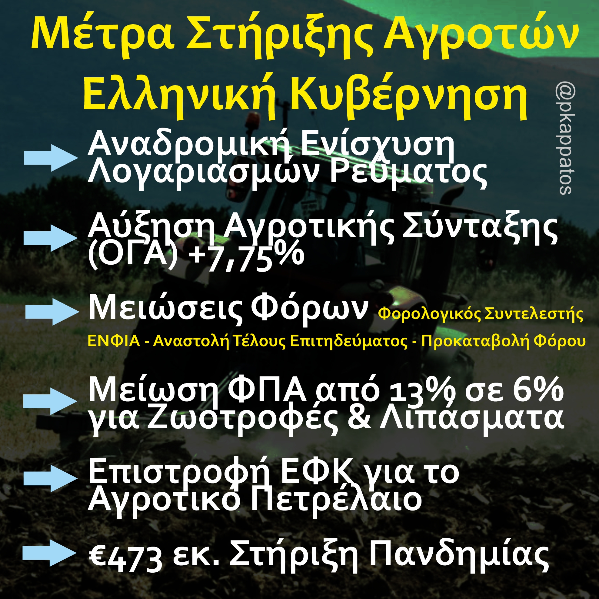 Σε εθνικό επίπεδο υπήρξαν μέτρα όπως η αύξηση της αγροτικής σύνταξης (ΟΓΑ) κατά 7,75%, η αναδρομική ενίσχυση λογαριασμών ρεύματος για αγροτική χρήση, η έκτακτη στήριξη για αγορά ζωοτροφών και πλήθος μόνιμων φοροαπαλλαγών και μειώσεων φόρων για τους αγρότες.