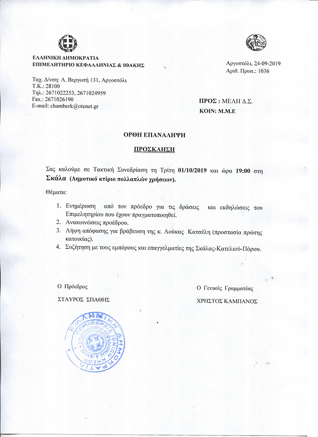Αλλαγή ημερομηνίας του προγραμματισμένου Δ.Σ. του Επιμελητηρίου στη Σκάλα.