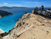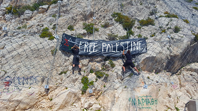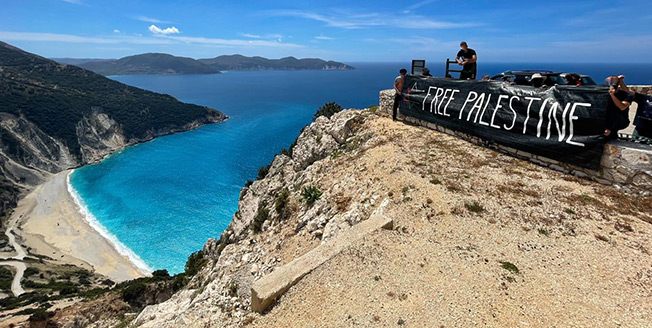 ενώ στην συνέχεια το πανό τοποθετήθηκε στο πιο εμβληματικό σημείο του νησιού στη θέση Χάρακας.