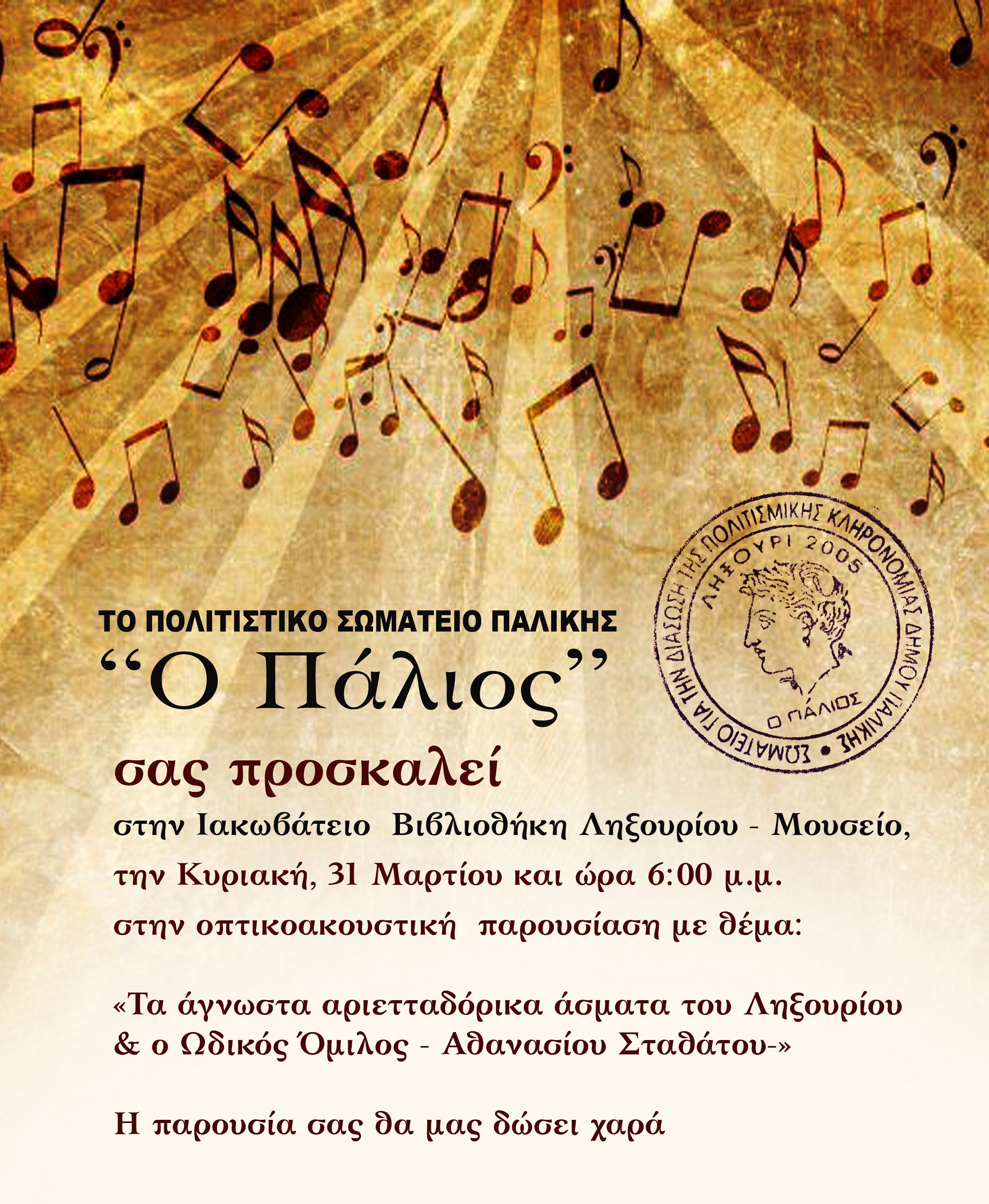 Ο βασικός σκοπός της Πολιτιστικής Εκδήλωσης του Πολιτιστικού Σωματείου – « Ο Πάλιος » Ληξουρίου, στις 31 Μαρτίου, Κυριακή, στην Ιακωβάτειο Βιβλιοθήκη- Μουσείο, ώρα 6:00 μ.μ. , είναι να φανερωθούν μέσα από αρχειακό υλικό (έγγραφο και φωνητικό) παλιά αυθεντικά ακούσματα, δείχνοντας μια ταυτότητα έκφρασης των προγόνων μας , που πριν λίγες δεκαετίες, ζούσε και εκφραζόταν μ’ άλλα μέσα ψυχής.