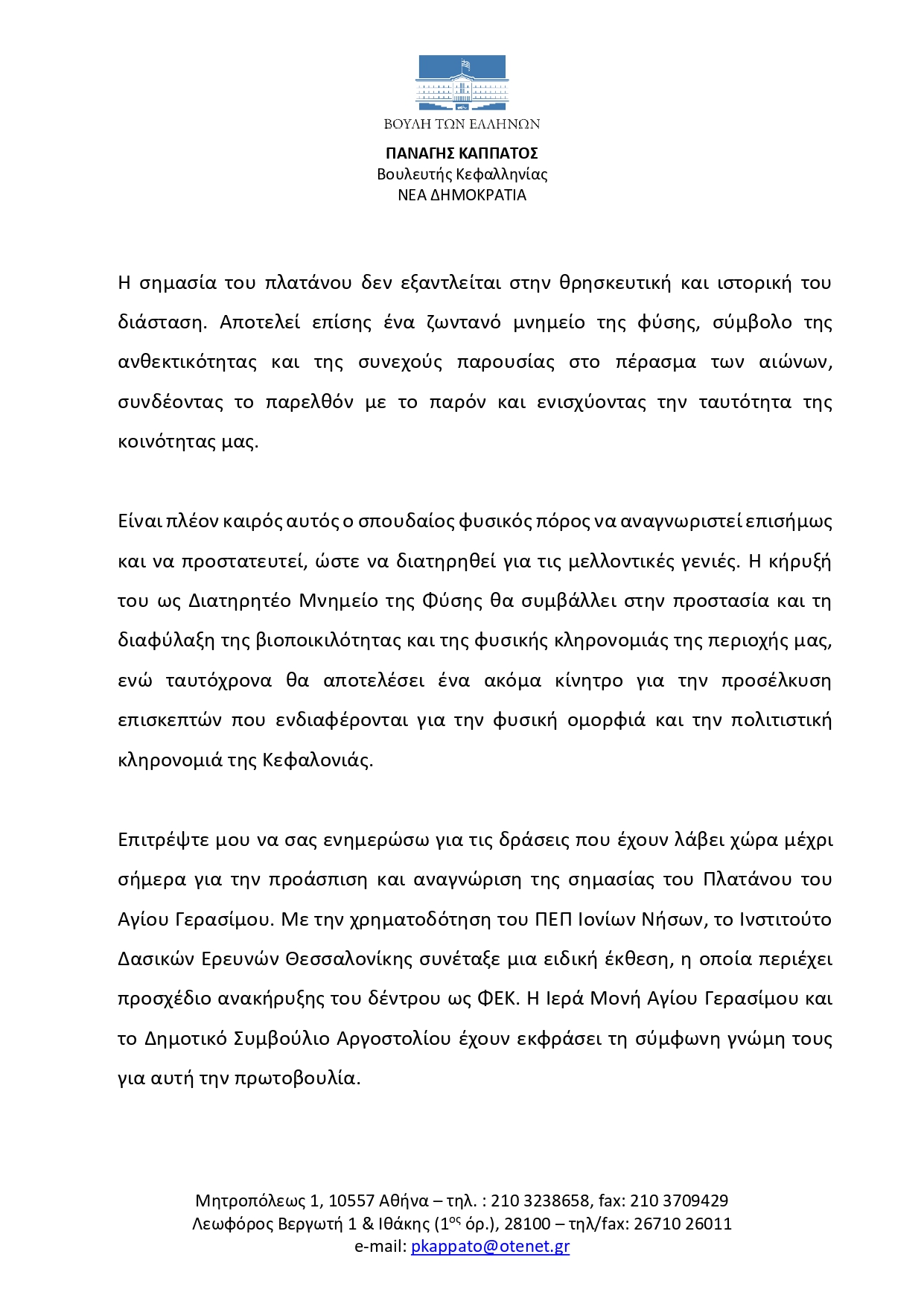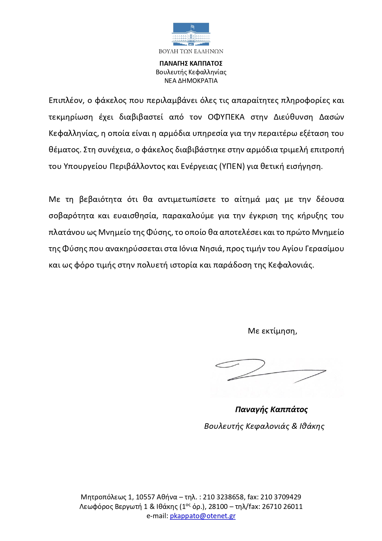 Με ιδιαίτερη χαρά και ικανοποίηση, θέλω να ευχαριστήσω τον Υπουργό Περιβάλλοντος και Ενέργειας, κ. Σκυλακάκη, για την έμπρακτη στήριξή του στην ανακήρυξη του Πλατάνου του Αγίου Γερασίμου Κεφαλονιάς ως Διατηρητέου Μνημείου της Φύσης.