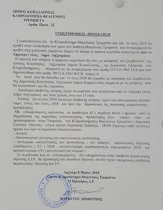Ανακοίνωση Κληροδότημα Θεαγένους Τρομπέτα