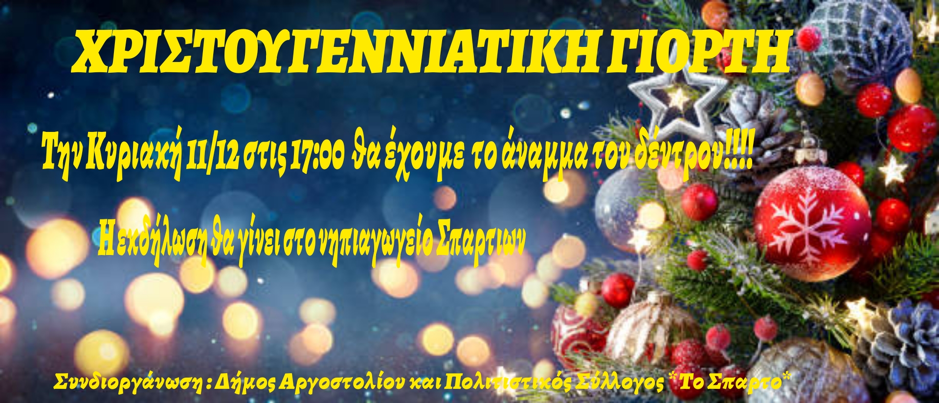 Την ΚΥΡΙΑΚΗ 11 ΔΕΚΕΜΒΡΙΟΥ στις 5.00μμ στο Νηπιαγωγείο Σπαρτιών, Ο ΠΟΛΙΤΙΣΤΙΚΟΣ ΣΥΛΛΟΓΟΣ ΣΠΑΡΤΙΩΝ “ΤΟ ΣΠΑΡΤΟ” σε συνεργασία με τον Δήμο Αργοστολίου, διοργανώνουν Χριστουγεννιάτικη γιορτή και ανάβουν τα φώτα του Δέντρου!!! Σας Περιμένουμε.