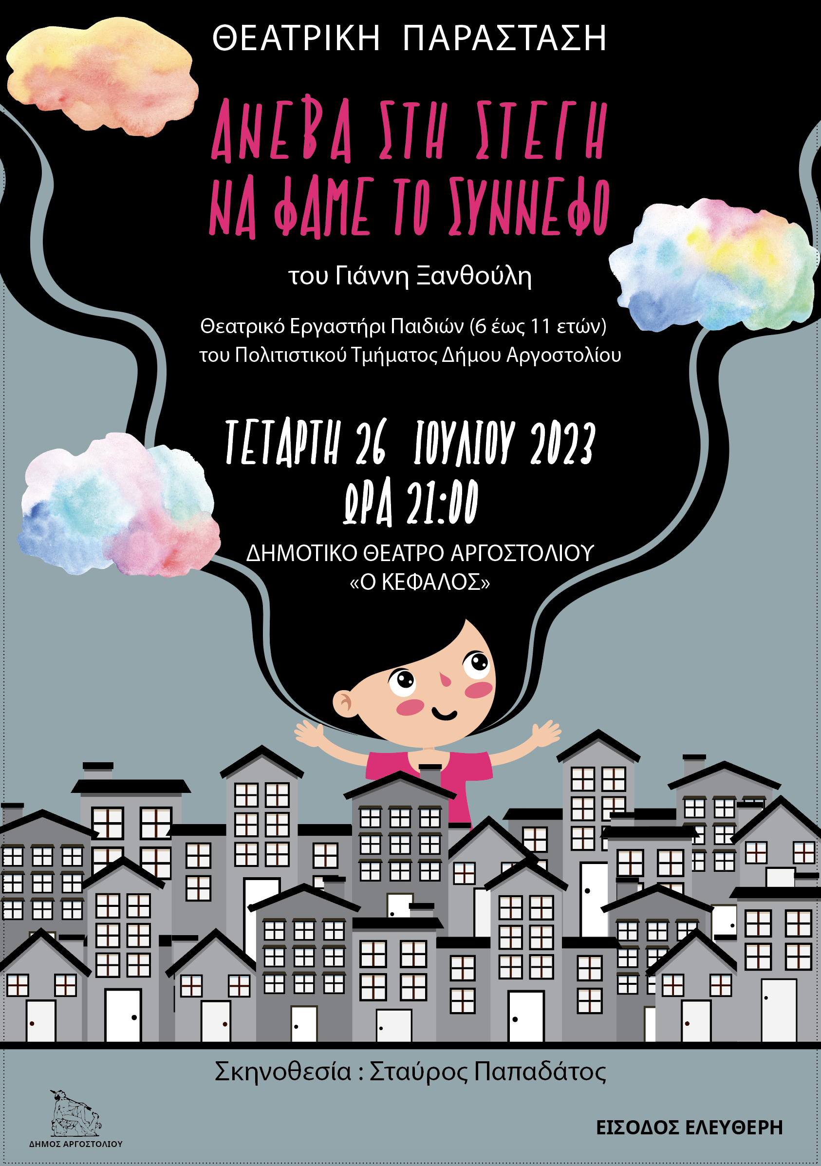 Την Τετάρτη 26 Ιουλίου και ώρα 21:00, στο Δημοτικό Θέατρο «Ο ΚΕΦΑΛΟΣ», το Παιδικό Τμήμα του Θεατρικού Εργαστηρίου Δήμου Αργοστολίου θα παρουσιάσει το έργο «ΑΝΕΒΑ ΣΤΗ ΣΤΕΓΗ ΝΑ ΦΑΜΕ ΤΟ ΣΥΝΝΕΦΟ», του Γιάννη Ξανθούλη σε σκηνοθεσία Σταύρου Παπαδάτου με Ελεύθερη Είσοδο.