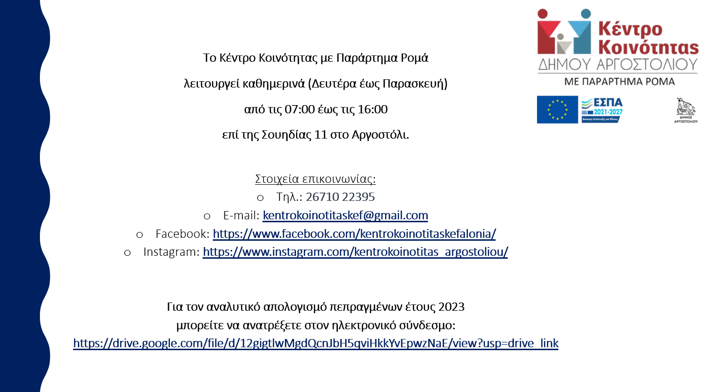 ΑΠΟΛΟΓΙΣΜΟΣ ΠΕΠΡΑΓΜΕΝΩΝ ΚΕΝΤΡΟΥ ΚΟΙΝΟΤΗΤΑΣ ΜΕ ΠΑΡΑΡΤΗΜΑ ΡΟΜΑ ΔΗΜΟΥ ΑΡΓΟΣΤΟΛΙΟΥ ΓΙΑ ΤΟ ΕΤΟΣ 2023