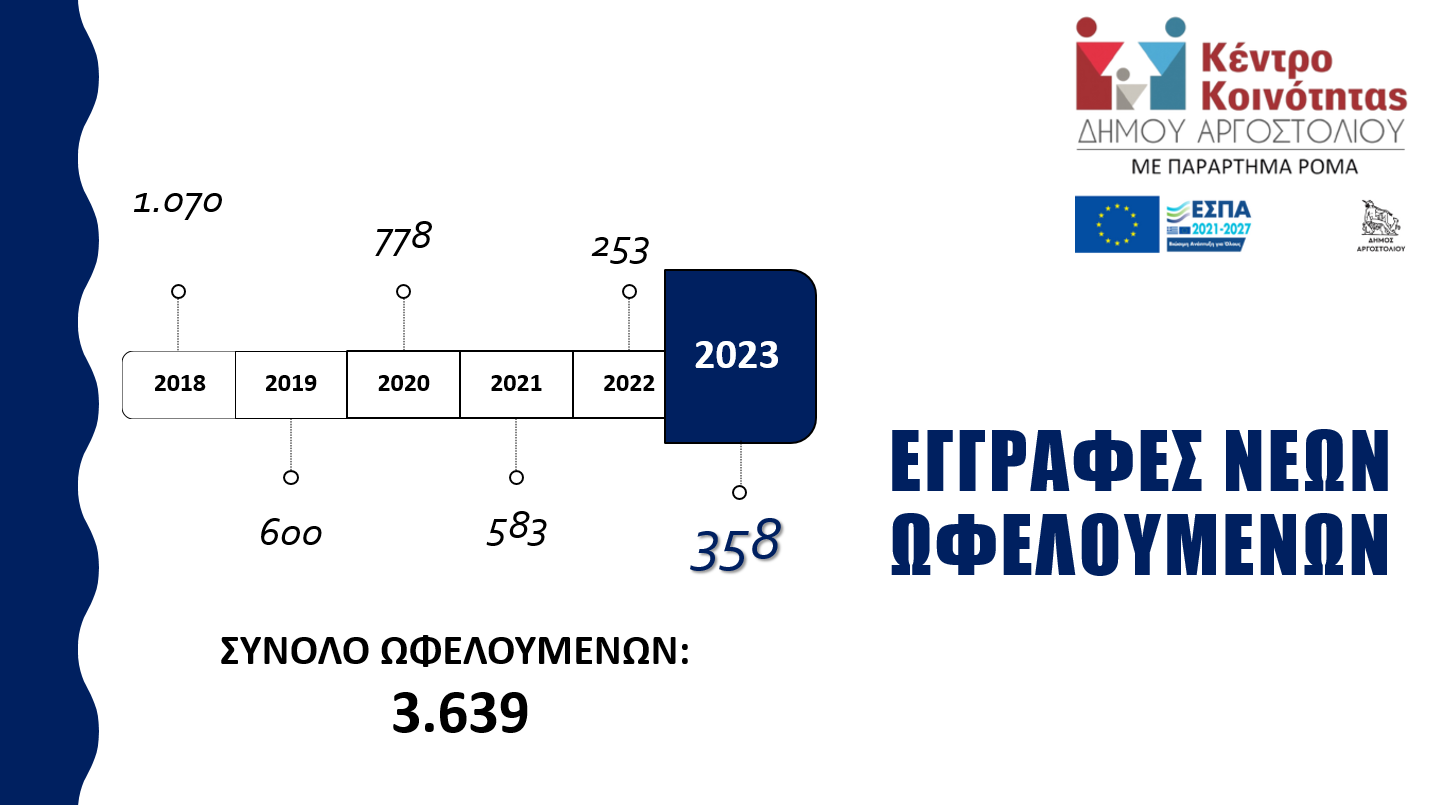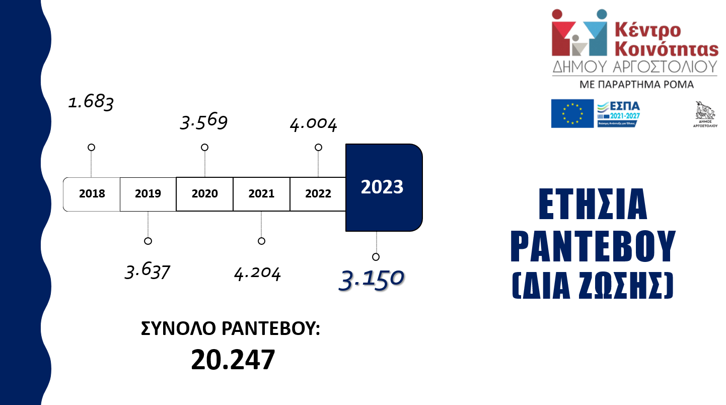 Κατά το έτος 2023, στο Κέντρο Κοινότητας με Παράρτημα Ρομά Δήμου Αργοστολίου διεκπεραιώθηκαν δια ζώσης 3.150 ραντεβού και εξυπηρετήθηκαν 1.032 πολίτες, εκ των οποίων οι 358 ήταν νέοι ωφελούμενοι.