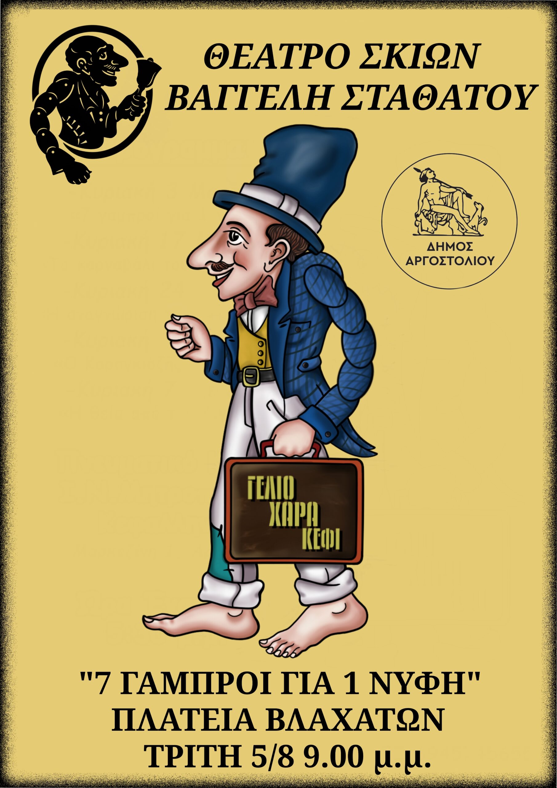 Σας περιμένουμε όλους για να απολαύσουμε την ξεκαρδιστική κωμωδία «ΕΠΤΑ ΓΑΜΠΡΟΙ ΓΙΑ ΜΙΑ ΝΥΦΗ!» από το θέατρο σκιών του Βαγγέλη Σταθάτου!Διοργάνωση Δήμος Αργοστολίου.