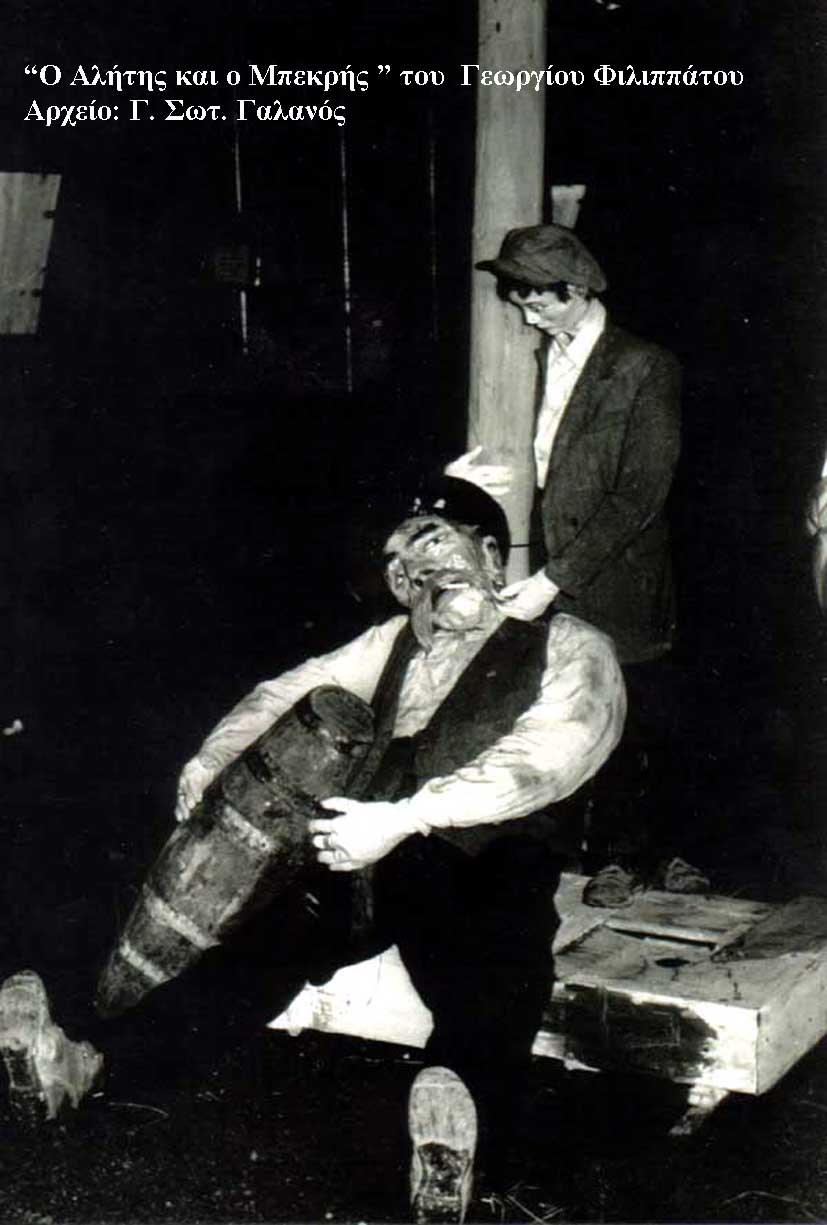 «Ο αλήτης και ο μπεκρής». Σε μια γωνία δρόμου καθισμένος και ακουμπισμένος σε κολόνα ένας μπεκρής, έχοντας στο πλάι του μια σκίτσα κρασί, έδειχνε να βρίσκεται χαμένος και πιωμένος έως το μεδούλι. Ένας αλήτης με το χαρακτηριστικό καπέλο του ήταν κοντά του, με το ένα χέρι αγκαλιάζει την κολόνα και με τ’ άλλο τραβά το μουστάκι του μπεκρή. Τα πρόσωπα ήταν από κερί και οι «παγωμένες» τους γκριμάτσες εκφραστικότατες, σμιλευμένες από τον Γιώργο Φιλιππάτο. Η κατασκευή αυτή δεν παρουσιάστηκε, λόγω αντιδράσεων, που πείσμωσαν τον ίδιο τον κατασκευαστή.