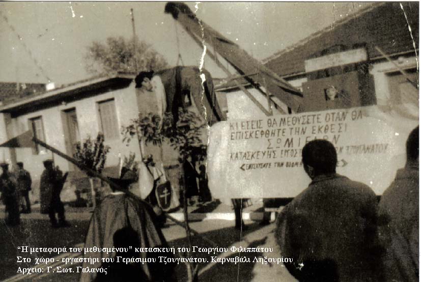 Είναι δε για τους νεότερους μάθημα, για το πώς πρέπει να είναι επιμελημένα και δουλεμένα τα άρματα και τα θέματα στο καρναβάλι. Παρόμοιο θέμα ήταν «Ο μεθυσμένος», που τόν μεταφέρουν στο σπίτι του με ένα γερανό. Το άρμα αυτό παρουσιάστηκε στο καρναβάλι και άφησε καλές εντυπώσεις. Ήταν κι αυτό κατασκευασμένο στο εργοστάσιο του Γεράσιμου Τζουγανάτου. Μελετημένο, απλό και παραστατικό, από τα καλλιτεχνικά χέρια του Γιώργου Φιλιππάτου.