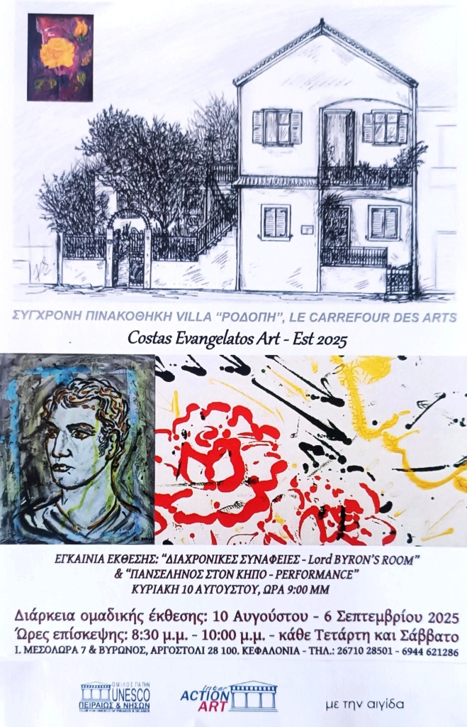 Την Κυριακή 10 Αυγούστου 2025, ώρα 8.30 μ.μ. στην Σύγχρονη Πινακοθήκη Villa ΡΟΔΟΠΗ στο Αργοστόλι της Κεφαλονιάς θα εγκαινιαστεί εικαστική έκθεση του ζωγράφου, ποιητή, θεωρητικού της τέχνης Κώστα Ευαγγελάτου, με τίτλο: “Διαχρονικές Συνάφειες”. Η ενότητα των έργων επικεντρώνεται σε μορφές και φιγούρες βυρωνικών ηρώων νεορομαντικού χαρακτήρα. Διεισδυτικά βλέμματα, αναδυόμενες μορφές, συμβολικές συνθέσεις ποιητικής και αρχαικής έμπνευσης με μοντερνιστική αποκρυστάλλωση.