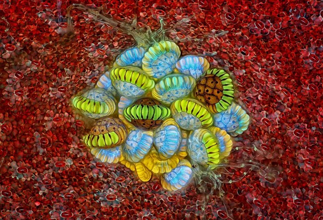 Τιμητική διάκριση: Σαν σκηνή από ταινία τρόμου, μία παρασιτική προνύμφη τρέφεται από την κοιλιακή χώρα αράχνης Matyas Molnar / Nikon Small World