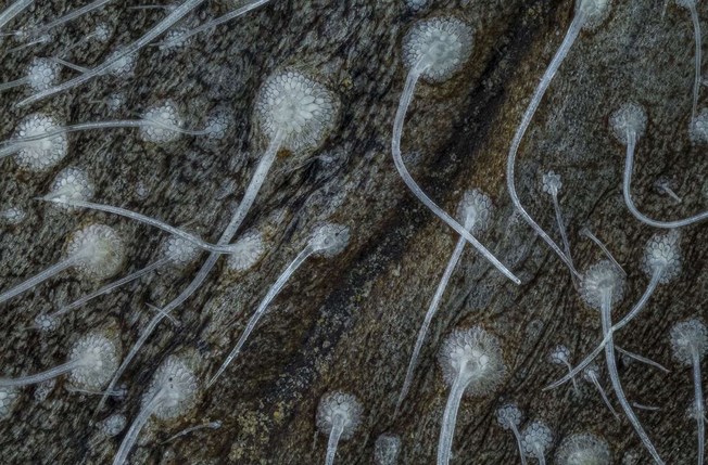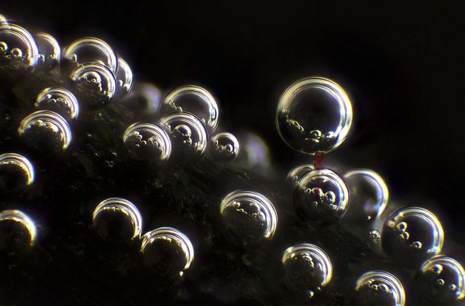 Εύφημος μνεία: Φυσαλίδες και μία μοναδική κόκκινη ίνα υφάσματος πάνω σε μια επιφάνεια βράχου, μεγεθυσμένα δέκα φορές Walter Piorkowski / Nikon Small World