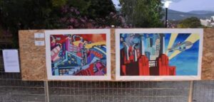 Εικόνες 6 & 7. «Fresh air» 2022. Ακρυλικό σε καμβά 150 Χ 88.5 cm.  «High voltage paradise» 2022. Ακρυλικό σε καμβά 160 X 90 cm. Τεχνική πλακάτου (πόστερ) με παστέλ.