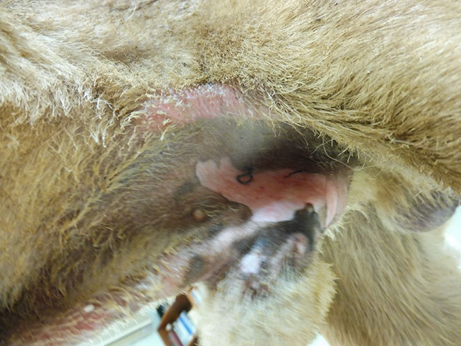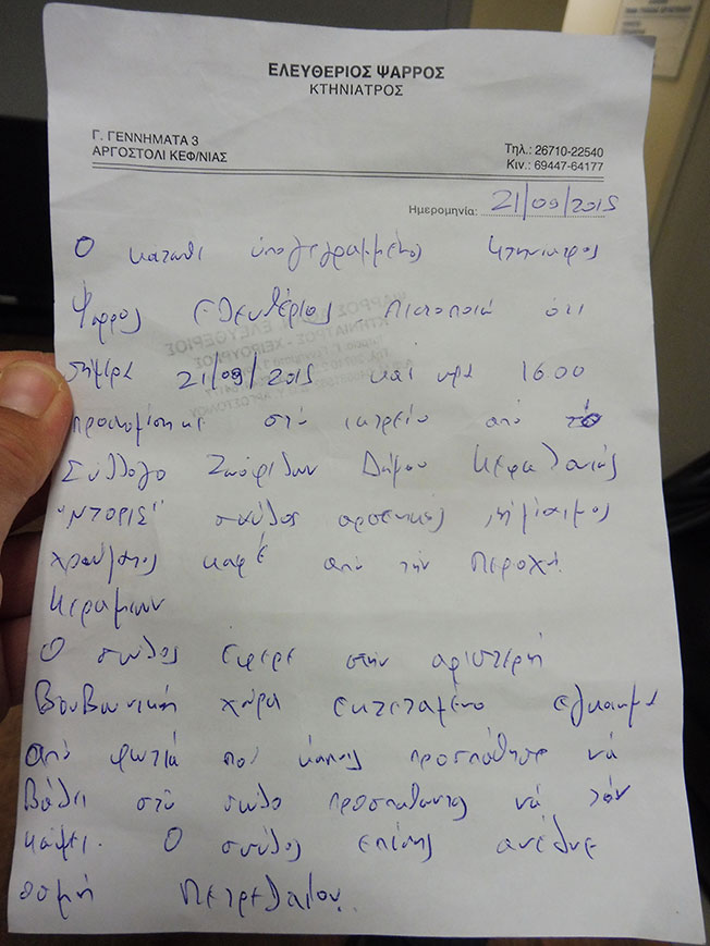 Οι εθελοντές μας ,που είχαν φθάσει στο χωριό, παρέλαβαν το άτυχο ζώο και με την συνοδεία της Α.Μ. και του μάρτυρα Σ.Ν. ,μετέβηκαν αμέσως στον κτηνίατρο κον Ψαρρό Ελευθέριο ,που διαπίστωσε βαρύτατο εκτεταμένο έγκαυμα στην αριστερή βουβωνική χώρα και του πρόσφερε ,για ακόμη μια φορά αφιλοκερδώς ,τις πρώτες βοήθειες και φυσικά ισχυρά παυσίπονα και σχήμα αντιβίωσης.