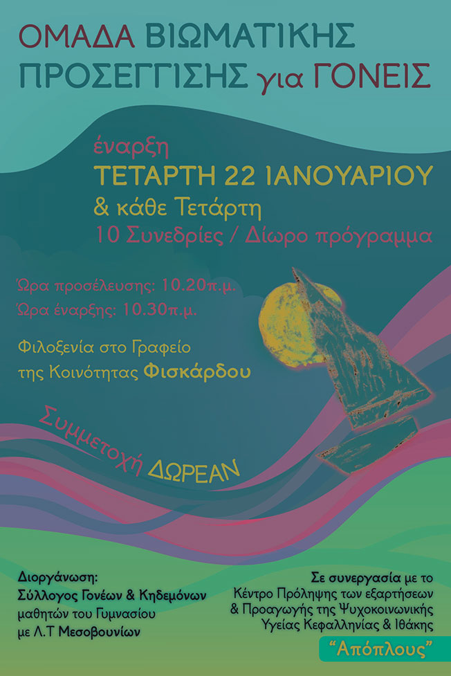 Την Τετάρτη 22 Ιανουαρίου 2020 και ώρα 10:30πμ, στο γραφείο της Κοινότητας Φισκάρδου, ξεκινούν οι εβδομαδιαίες συναντήσεις της Ομάδας Βιωματικής Προσέγγισης Γονέων που διοργανώνει ο Σύλλογος Γονέων και Κηδεμόνων Μαθητών Γυμνασίου με Λ.Τ Μεσοβουνίων σε συνεργασία με το Κέντρο Πρόληψης των Εξαρτήσεων και Πρόληψης της Ψυχοκοινωνικής Υγείας Κεφαλληνίας και Ιθάκης “ΑΠΟΠΛΟΥΣ”.