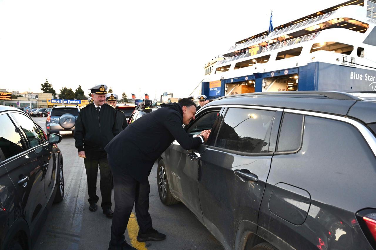 Στη συνέχεια, συνοδευόμενος από την ηγεσία του Λιμενικού Σώματος, διέσχισε το λιμάνι από την Πύλη Ε7 έως την Πύλη Ε1, όπου είχε την ευκαιρία να συνομιλήσει και να ανταλλάξει ευχές με επιβάτες και οδηγούς φορτηγών οχημάτων.