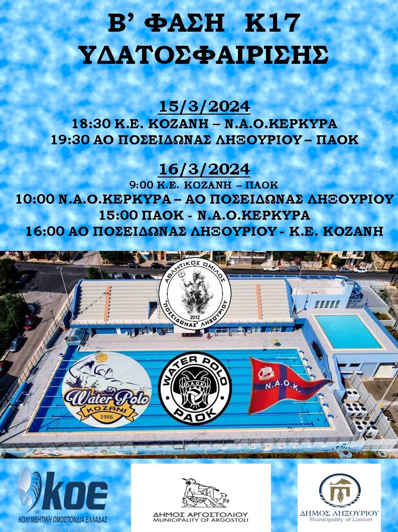 Σας προσκαλούμε να παραβρεθείτε στο Δημοτικό Κολυμβητήριο Αργοστολίου 15-16 Μαρτίου,όπου φιλοξενείται η Β Φάση Υδατοσφαίρισης Κ17, στηρίζοντας την ομάδα του νησιού μας,τα παιδιά μας να πραγματοποιήσουν το όνειρο τους και να προκριθούν στην επόμενη Φάση!!!