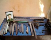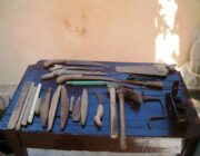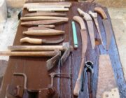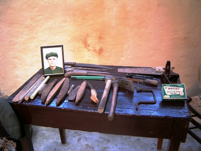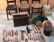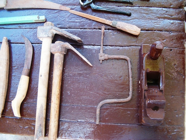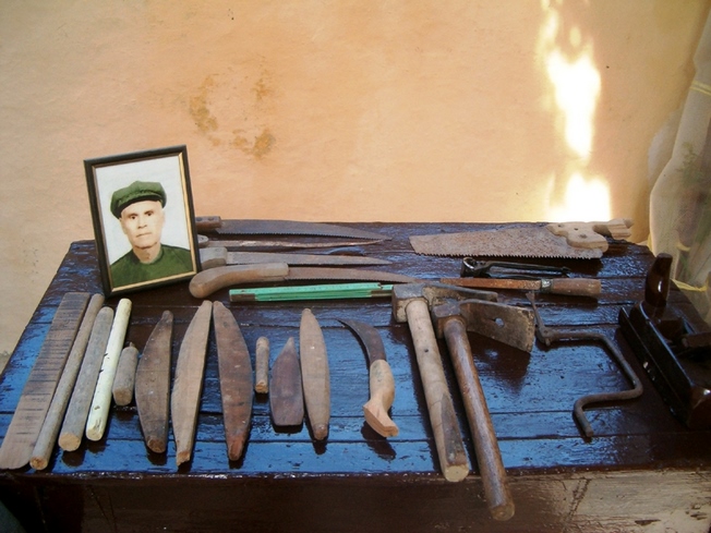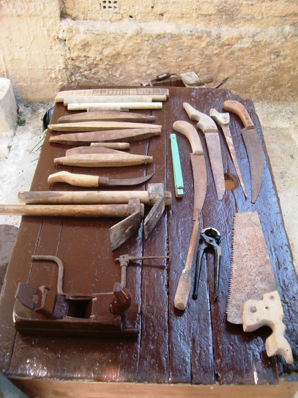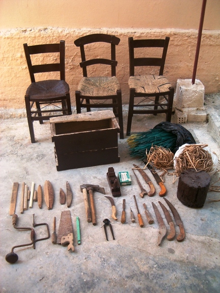 Σ’ ένα μεγάλο σακούλι κι άλλες φορές σε μία ξύλινη μικρομεσαία κασέλα, είχε μαζεμένα τα εργαλεία του. Πλάνες, ράσπες, σύρμα, σκερπάνι, φαλτσέτα, λίμες, καρφιά και άλλα εργαλεία, απαραίτητα για τη δουλειά του.