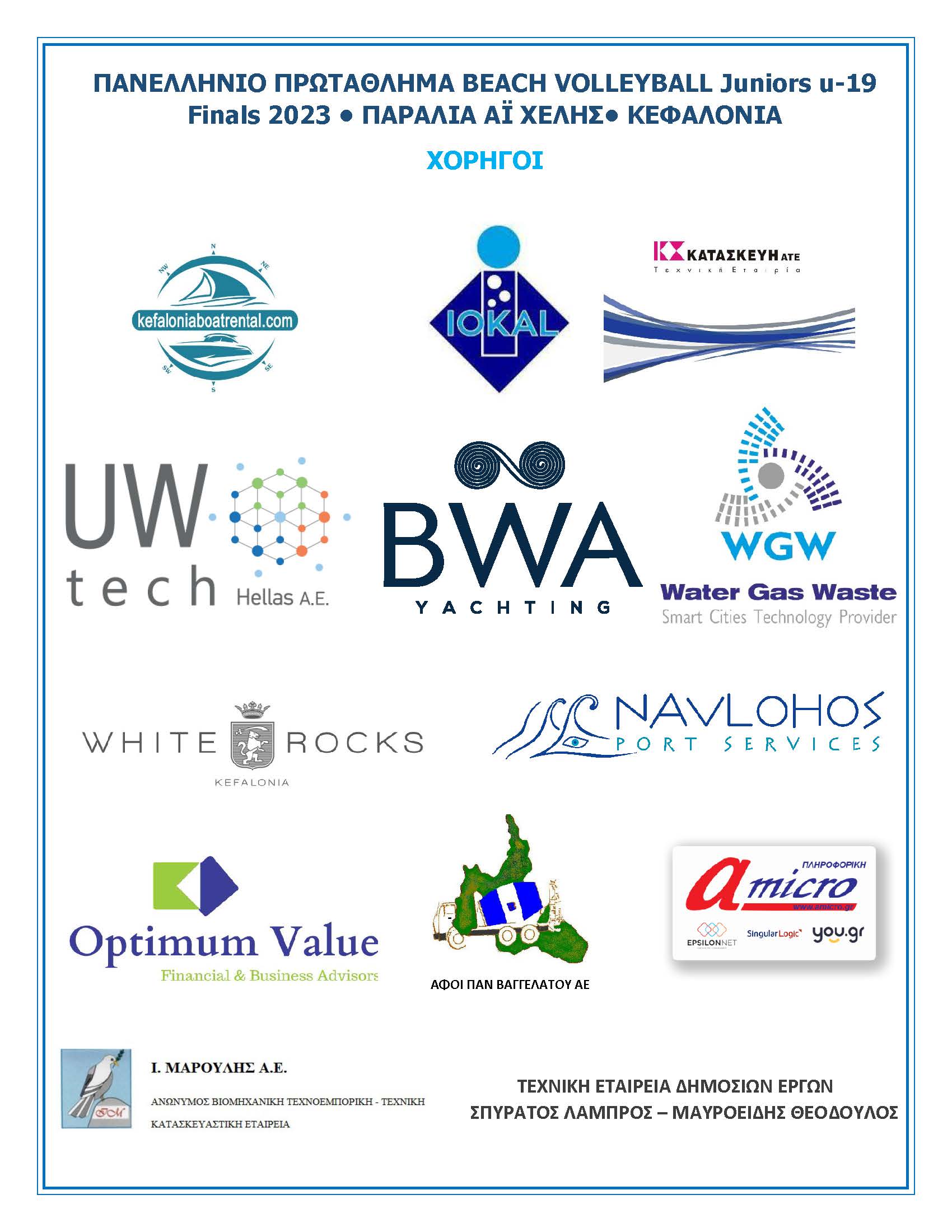 Έχοντας ολοκληρωθεί η διοργάνωση των τελικών του Πανελλήνιου Πρωταθλήματος Beach Volleyball Juniors u-19 2023, στην παραλία του Αϊ-Χέλη, θα θέλαμε να ευχαριστήσουμε τόσο τους συνδιοργανωτές (Ελληνική Ομοσπονδία Πετοσφαίρισης, Περιφέρεια Ιονίων Νήσων και Αθλητικό Σωματείο BV Ammos Κεφαλονιάς) για την άψογη συνεργασία μας, αλλά και τους χορηγούς μας, που μας στήριξαν σε αυτό το εγχείρημα.