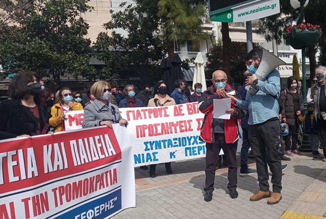 13.3.2021. Ο Θανάσης Ζαπάντης, εκπρόσωπος εργαζομένων του Νοσοκομείου Αγία Όλγα σε συγκέντρωση στη Ν. Ιωνία ενάντια στην κρατική καταστολή, στο πλαίσιο του διήμερου #artattack. (Φωτό: 902).