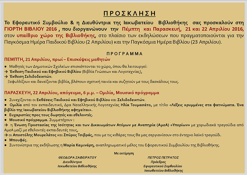 Γιορτή Βιβλίου 2016 – Ιακωβάτειος Βιβλιοθήκη