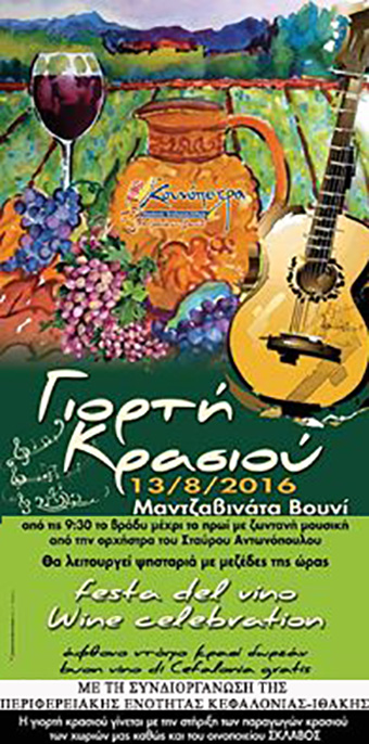 Ο Πολιτιστικός Εξωραϊστικός Σύλλογος Μαντζαβινάτων-Βουνίου σε συνδιοργάνωση με την Περιφερειακή Ενότητα Κεφαλονιάς-Ιθάκης, σας προσκαλούν στην αποψινή ετήσια γιορτή κρασιού, η οποία θα πραγματοποιηθεί όπως πάντα στον χώρο του Συλλόγου μας στα Μαντζαβινάτα Ληξουρίου.