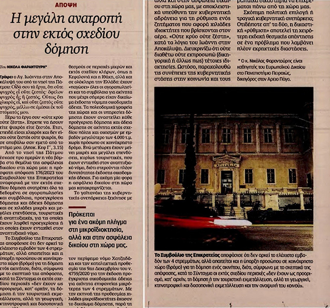 Στις 21 Μαρτίου 2023 είχα προειδοποιήσει με άρθρο μου στην ΚΑΘΗΜΕΡΙΝΗ (επισυνάπτεται) για την ανάγκη άμεσης νομοθετικής παρέμβασης για την αποκατάσταση της ασφάλειας δικαίου μετά την απόφαση του Συμβουλίου της Επικρατείας με την οποία κρίθηκε (για τη συγκεκριμένη υπόθεση) ότι δεν αρκεί το ελάχιστο εμβαδόν των 4 στρεμμάτων, αλλά απαιτείται και η ύπαρξη προσώπου σε κοινόχρηστο χώρο (δρόμο) για την δόμηση ενός ακινήτου.