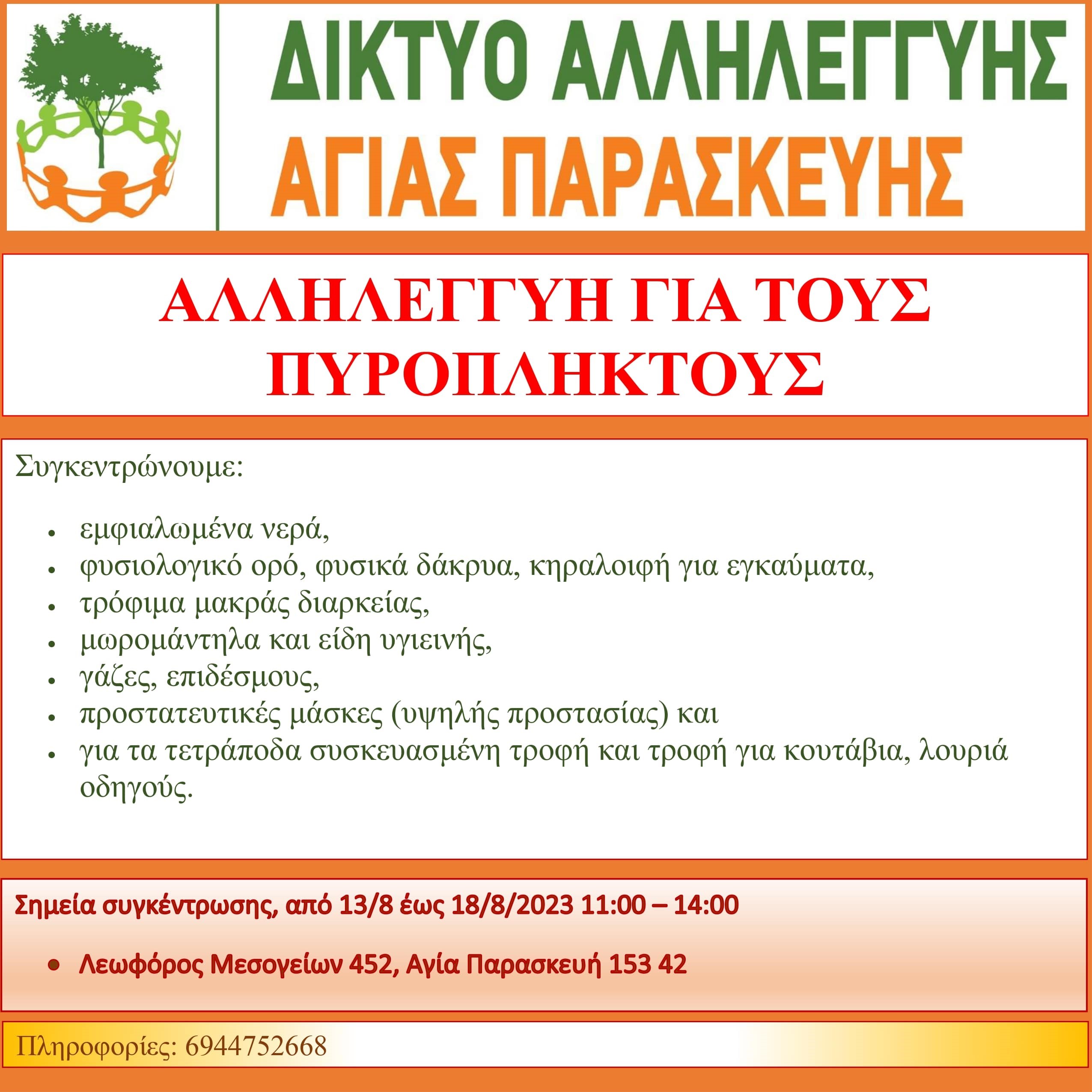 Δίκτυο Αλληλεγγύης Αγίας Παρασκευής Στήριξη των πυρόπληκτων της βορειοανατολικής Αττικής