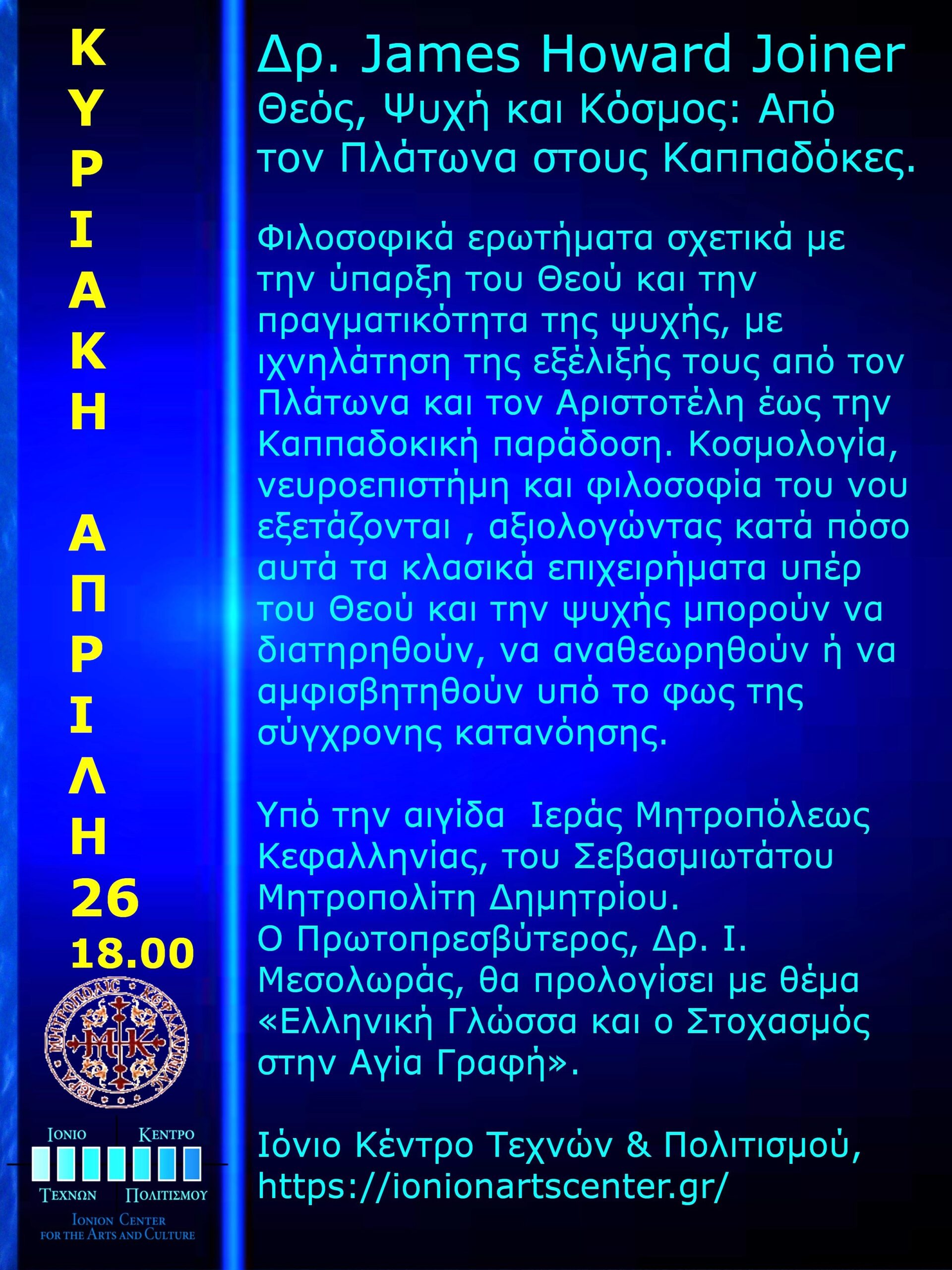 Αντικείμενο της Διάλεξης ”Φιλοσοφικά ερωτήματα σχετικά με την ύπαρξη του Θεού και την πραγματικότητα της ψυχής, παρακολουθώντας την εξέλιξή τους από τον Πλάτωνα και τον Αριστοτέλη έως την Καππαδοκική παράδοση, με ιδιαίτερη έμφαση στην Αγία Μακρίνα τη Νεότερη. Διερευνά κλασικά επιχειρήματα από την αιτιότητα, την κίνηση και τη νοητότητα για την ύπαρξη μιας πρώτης αρχής, παράλληλα με αντιλήψεις για την ψυχή ως πηγή ζωής και νόησης. Οι ιδέες αυτές επανεξετάζονται στη συνέχεια στο πλαίσιο της πρώιμης ανατολικής πατερικής περιόδου, όπου αναπτύσσονται μέσα σε μια μεταφυσική θεώρηση του κόσμου και της ανθρώπινης φύσης. Η διάλεξη ολοκληρώνεται με αναφορά σε σύγχρονες συζητήσεις στην κοσμολογία, τη νευροεπιστήμη και τη φιλοσοφία του νου, αξιολογώντας κατά πόσο αυτά τα κλασικά επιχειρήματα για τον Θεό και την ψυχή μπορούν να διατηρηθούν, να αναθεωρηθούν ή να αμφισβητηθούν υπό το φως της σύγχρονης κατανόησης”.Δρ. James Howard Joiner