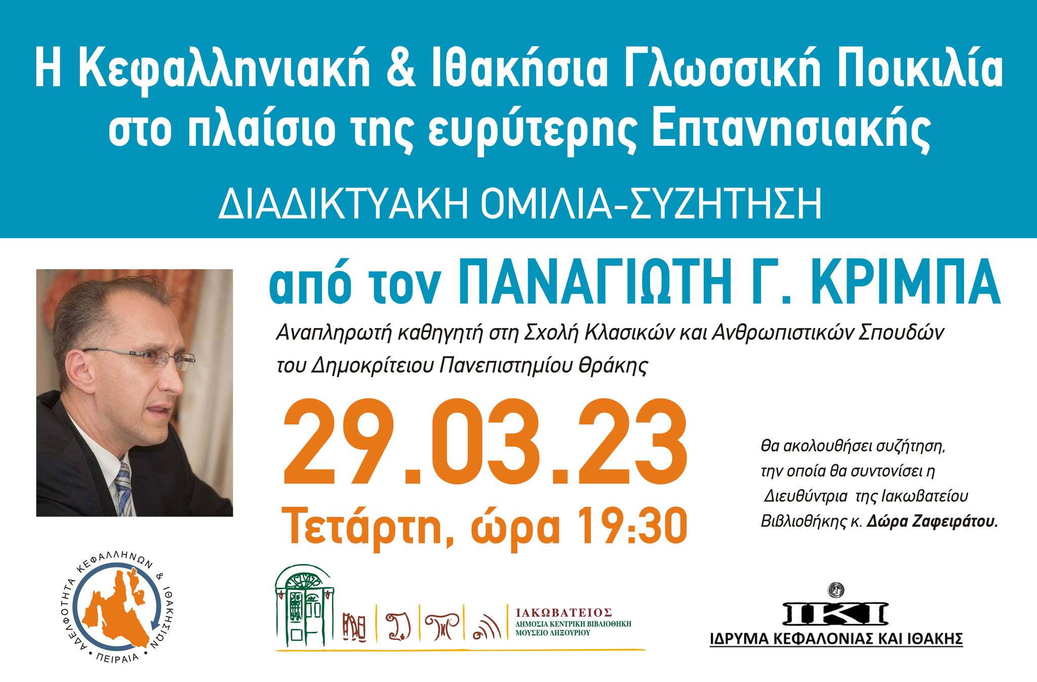 Η Αδελφότητα Κεφαλλήνων και Ιθακησίων Πειραιά, η Ιακωβάτειος Δημόσια Κεντρική Βιβλιοθήκη – Μουσείο Ληξουρίου και το Ίδρυμα Κεφαλονιάς και Ιθάκης διοργανώνουν την Τετάρτη, 29 Μαρτίου 2023, στις 7.30 μ.μ., διαδικτυακή ομιλία-συζήτηση με θέμα: