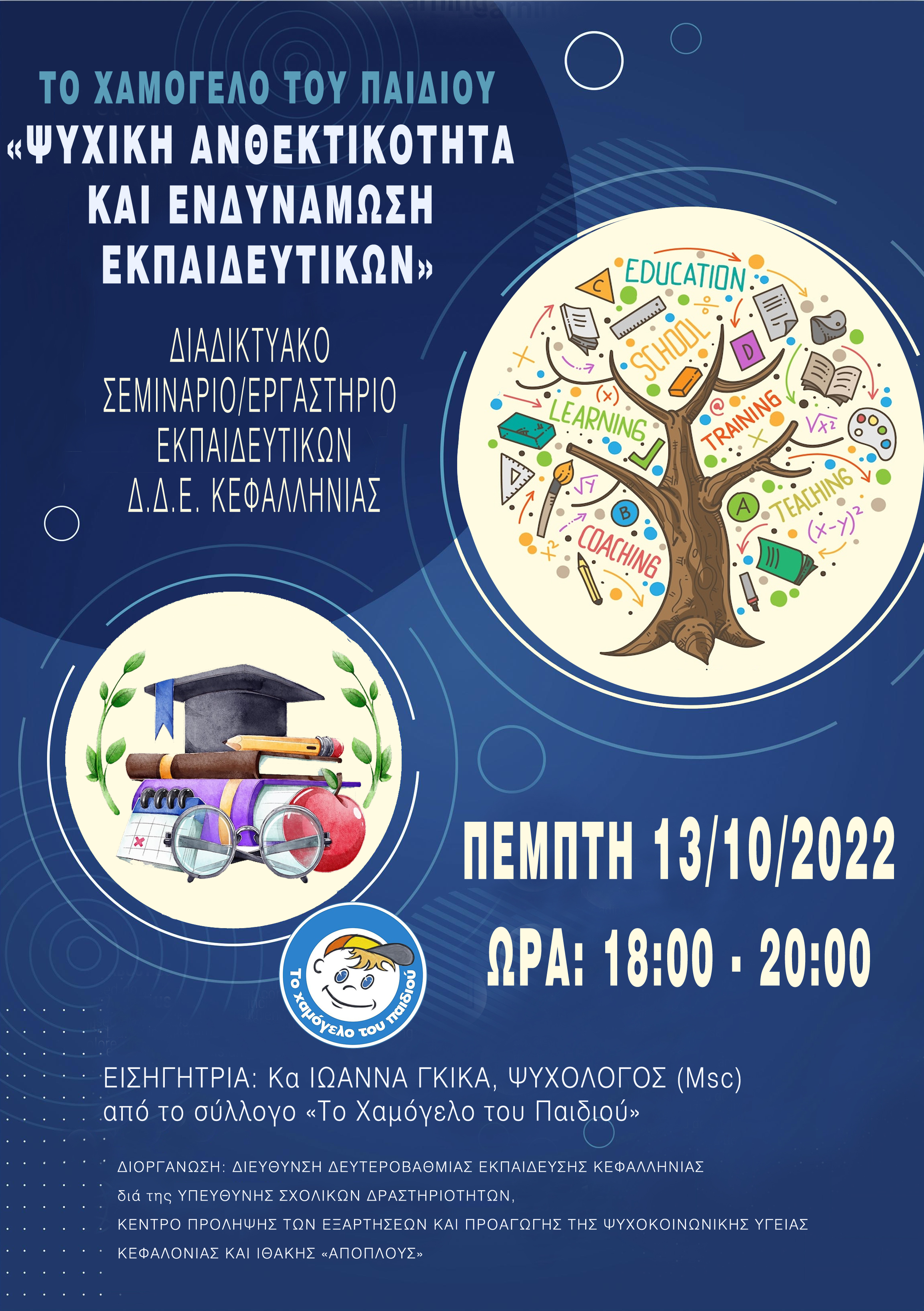 Η Διεύθυνση Δευτεροβάθμιας Εκπαίδευσης Κεφαλληνίας δια της Υπεύθυνης Σχολικών Δραστηριοτήτων και το Κέντρο Πρόληψης των Εξαρτήσεων και Προαγωγής της Ψυχοκοινωνικής Υγείας Κεφαλληνίας και Ιθάκης «Απόπλους», σε συνεργασία με τον Οργανισμό «Το Χαμόγελο του Παιδιού», συνδιοργανώνουν Διαδικτυακό Σεμινάριο-Εργαστήριο για εκπαιδευτικούς της Δ.Δ.Ε. Κεφαλληνίας, την Πέμπτη 13/10/2022 και ώρα 18:00-20:00, με θέμα: