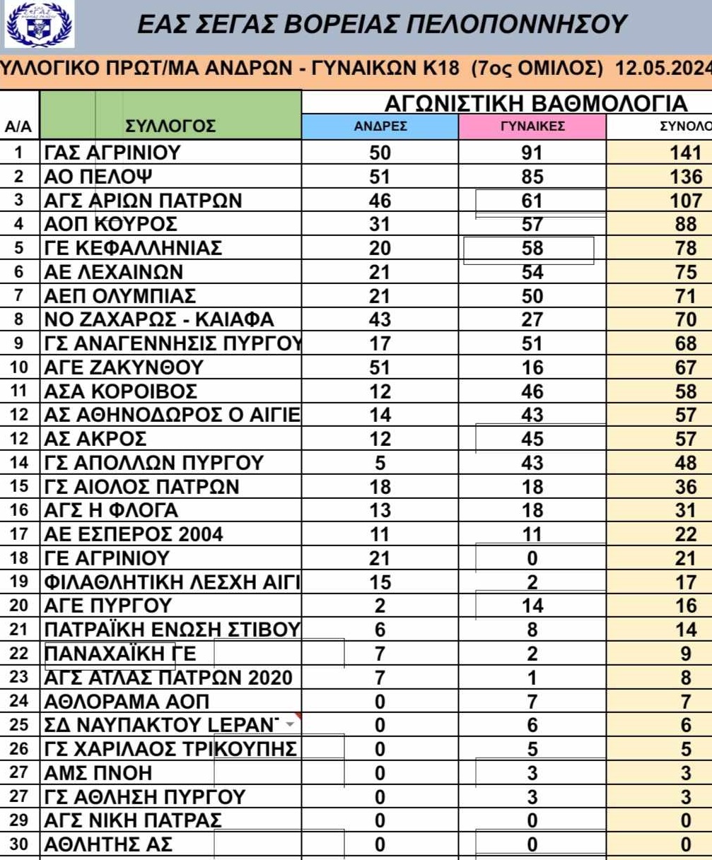 Αναλυτικά τα αποτελέσματα των αθλητών και των αθλητριών της ΓΕΚ